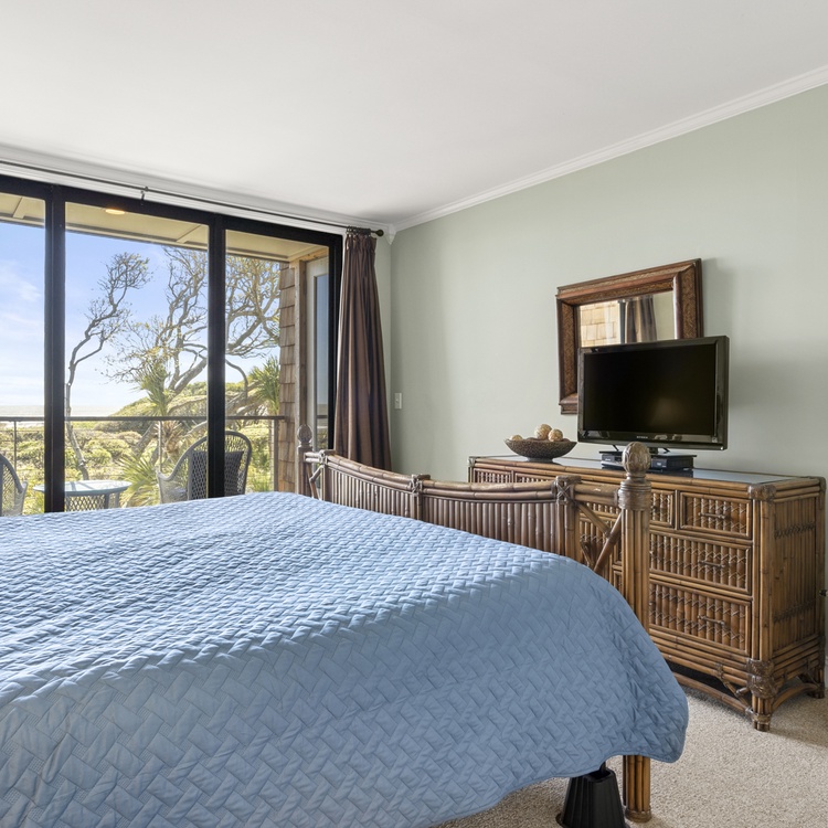 The king bedroom is beautifully appointed and has a chair for reading, a TV, and sliding glass doors that lead to a private oceanfront balcony. The bathroom has a spacious tile/glass shower.