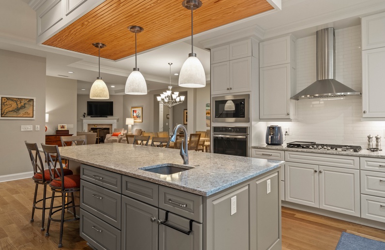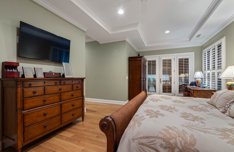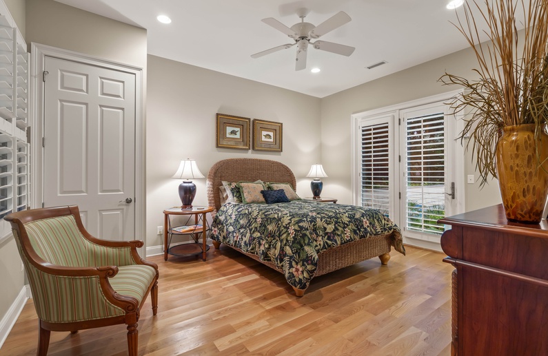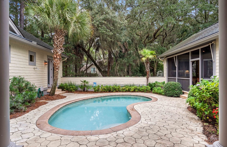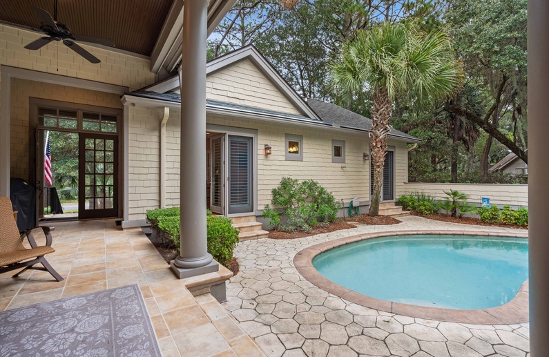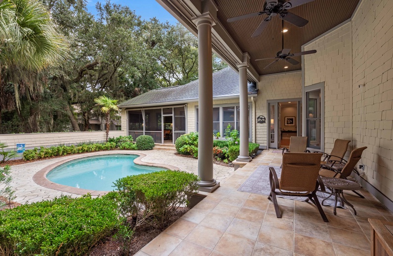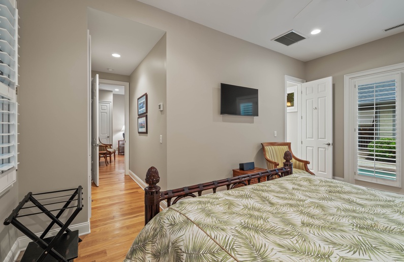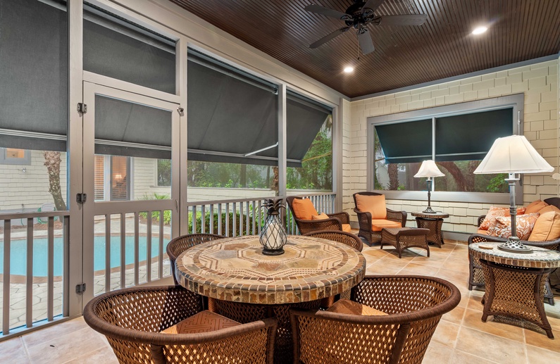 Continuing toward the main house, you’ll pass the inviting private pool, perfect for relaxing under the sun. Inside, the living area offers a spacious sectional sofa, two additional accent chairs, and a large television for effortless entertainment. Off the living area, the screened-in porch provides a tranquil escape, furnished with a bistro table, comfortable lounge seating, and direct access to the pool deck.