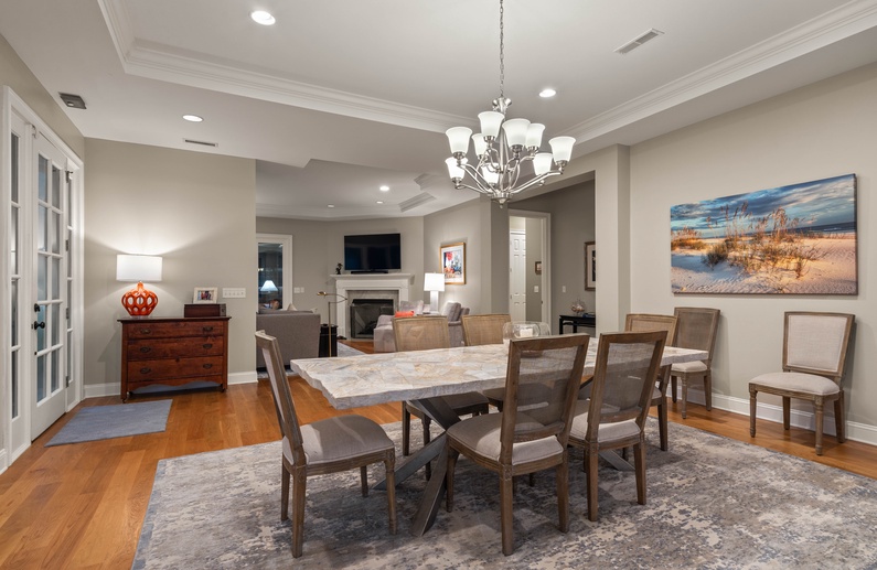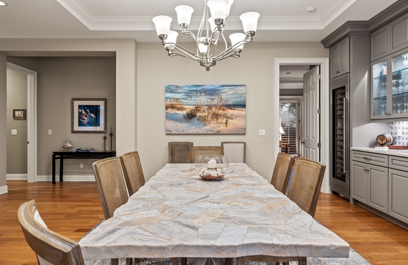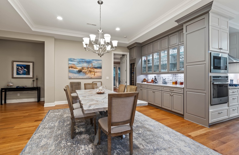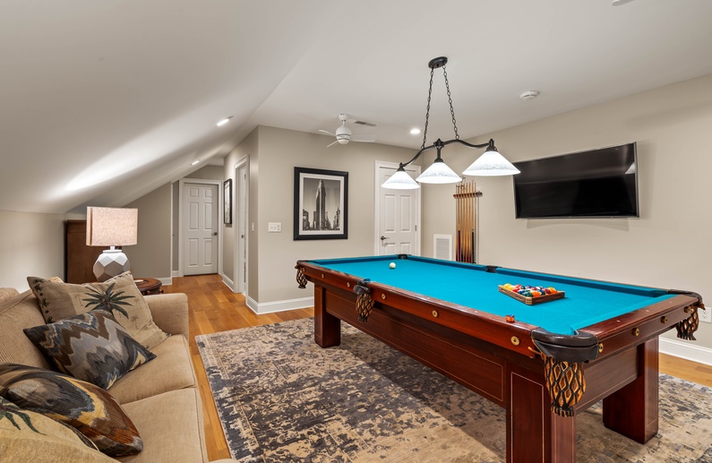 The chef’s kitchen is beautifully designed with sleek cabinetry, stainless steel appliances, and modern finishes. A large center island offers casual seating, while the adjacent dining area, with a table for up to eight, is ideal for gatherings. A sophisticated wet bar, featuring a large sub-zero wine cooler, enhances the dining space, providing both functionality and style. Ascend the stairs and you'll find the lounge/game area, complete with a pool table and even a dartboard. The fifth full bathroom is located off the game room as well.