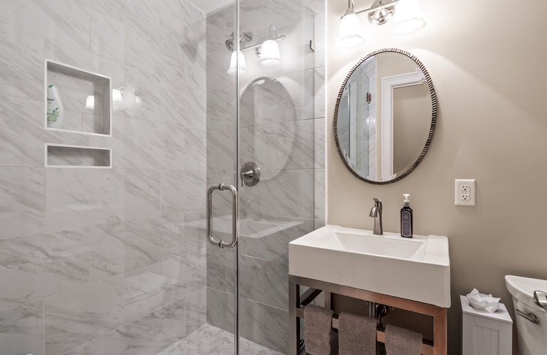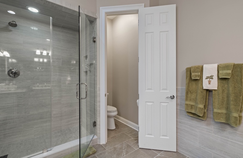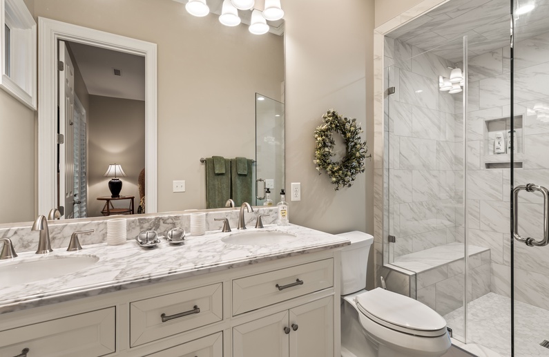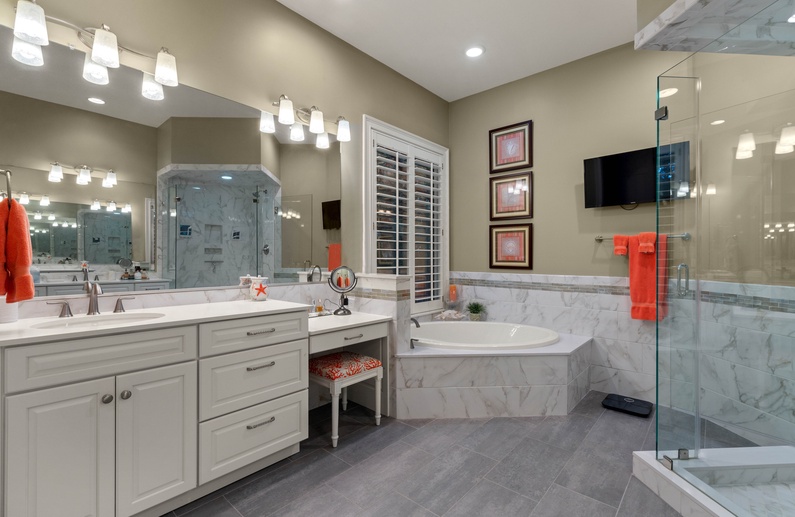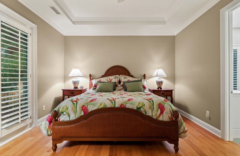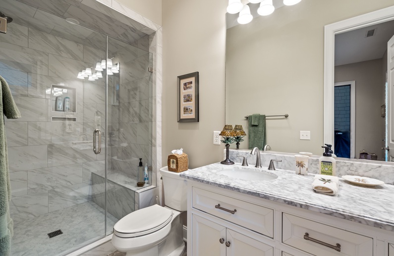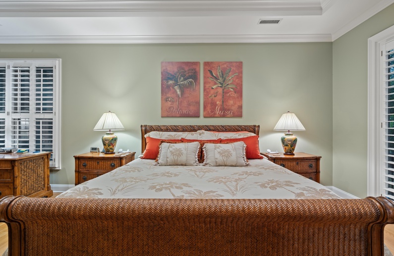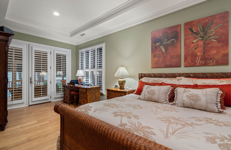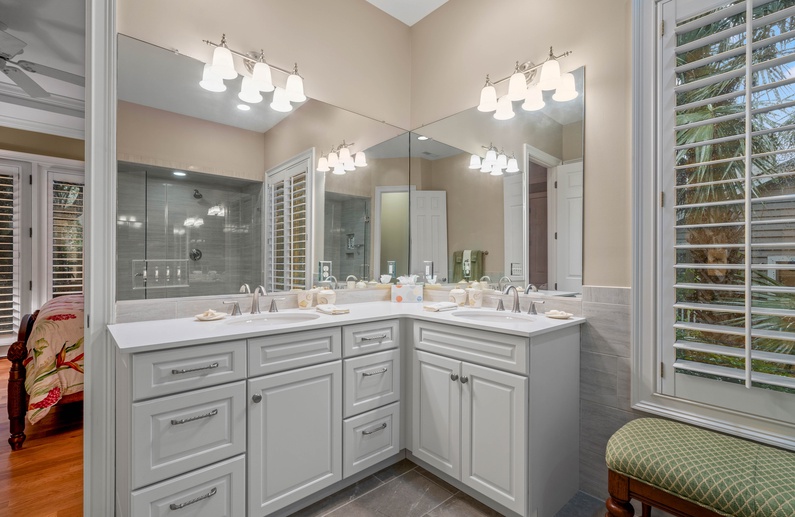 The primary suite is a serene retreat. It features a king bed, a dedicated workspace ideal for remote needs, and an en suite bathroom with dual vanities, walk-in shower and a luxurious soaking tub. A second king bedroom offers equal comfort with an en suite bath, showcasing a walk-in shower and dual vanities.