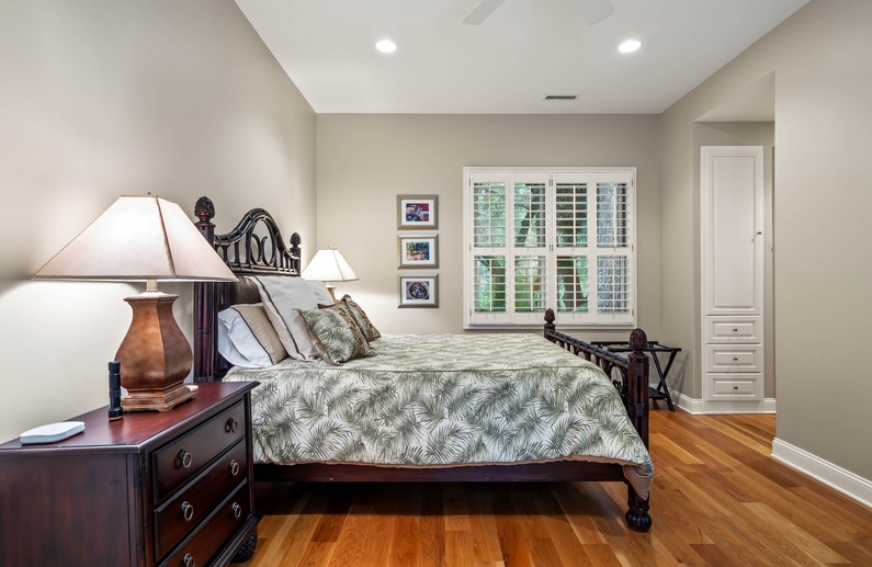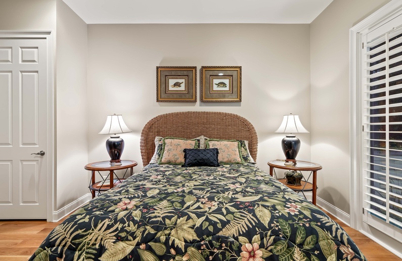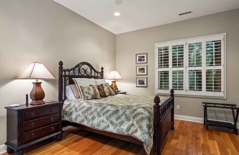 Upon arrival, you are welcomed by a charming guest house just to the left of the entry. This private retreat features two well-appointed queen bedrooms, each with their own en suite bathroom.