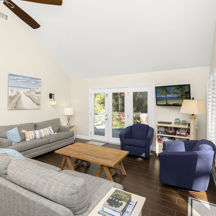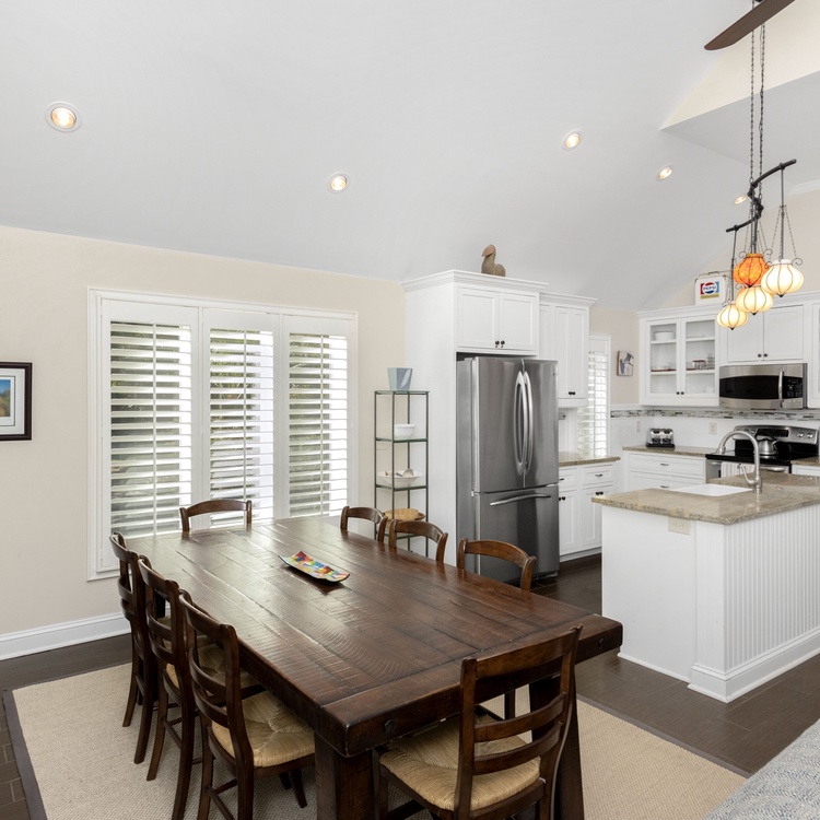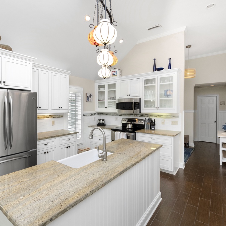 Relax on the large back deck and enjoy the lagoon views and the abundant wildlife surrounding this home. Enjoy many custom touches, including beautiful tiled floors, granite countertops in the kitchen and bathrooms, and comfortable furnishings throughout the home. The kitchen has custom light fixtures, white cabinets, stainless steel appliances, tile backsplash, and granite countertops. The center island overlooks the living area with lots of windows and glass doors for enjoying the views. The kitchen opens to the dining area with a wooden table and seating for 8. The living area has plenty of seating, including two sofas and two cozy chairs. A Bluetooth speaker is located in the living area so you can enjoy your favorite music during your stay. Two sets of glass doors lead out to the large wrap-around deck featuring a pool, gas grill, and peaceful lagoon views.