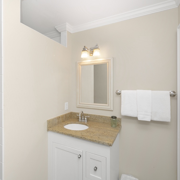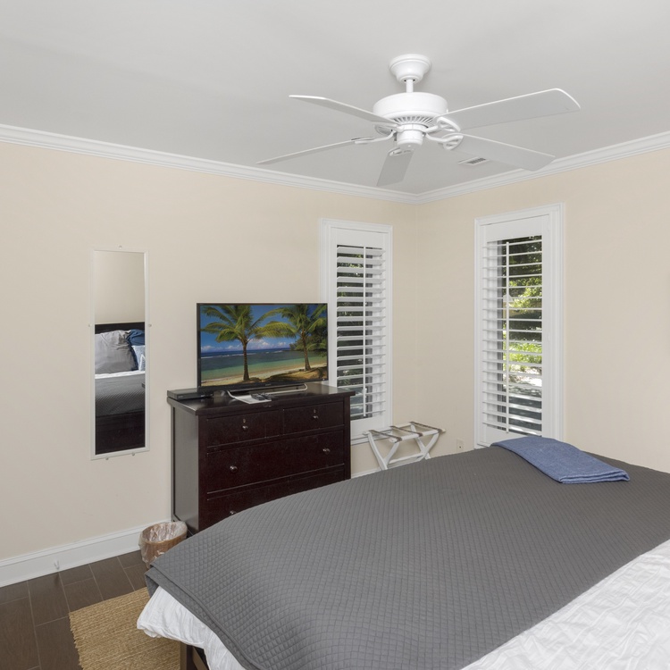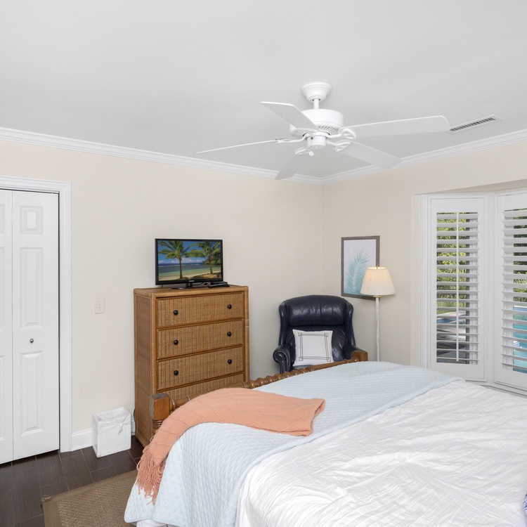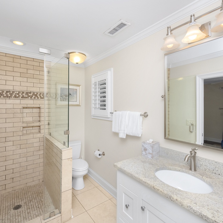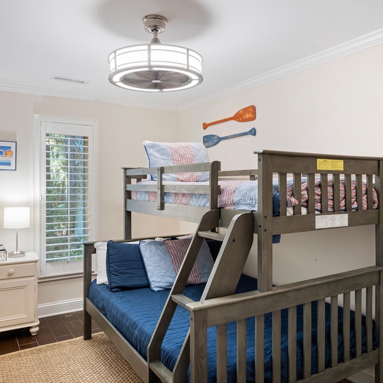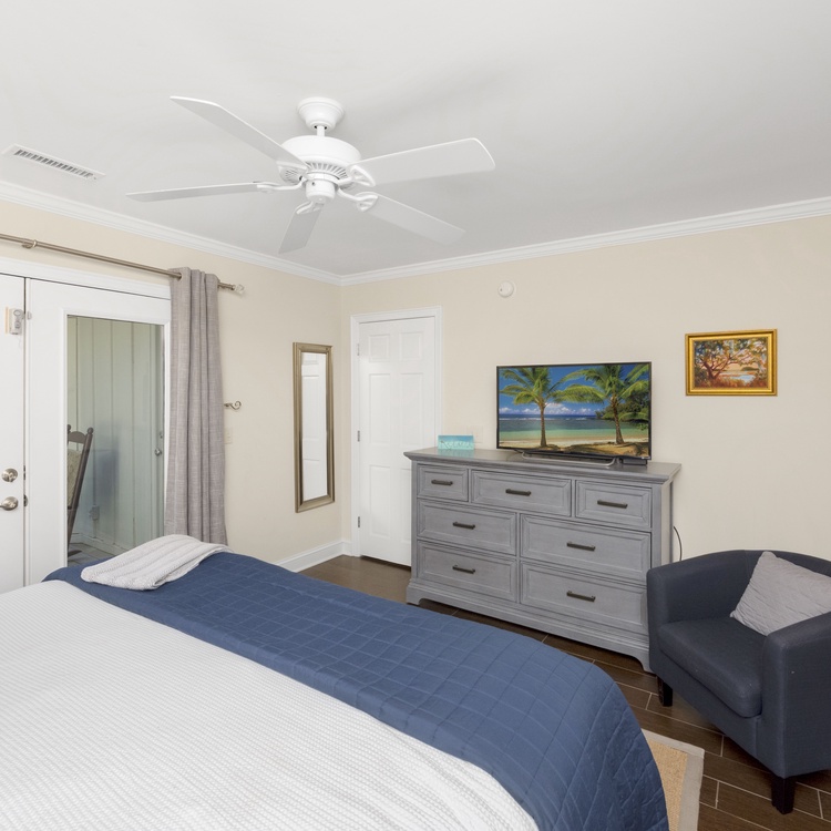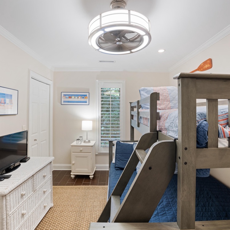 The primary bedroom, located in the rear of the home, has a king-sized bed, TV, French doors leading to the deck, and private bathroom with a tiled shower with glass enclosure. A secondary bedroom is located on the front of the home with a king-sized bed, flat-screen TV, and private bathroom with granite counters and a nicely tiled shower. A bedroom is just off of the kitchen with a queen bed, reading chair, dresser, and flat-screen TV. This bedroom shares a bathroom with a tub/shower combination located down the hall. The fourth bedroom has a twin over full bunk bed, a TV, and an attached bathroom that is shared with the queen bedroom.