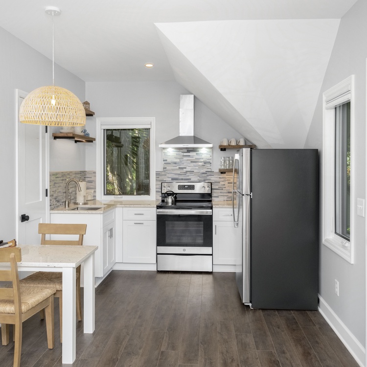 A guest suite with private entry is located above the standalone garage (the garage is not available for guest use). The suite has an open living area with a queen sleeper sofa and TV, a full kitchen with stainless steel appliances and and granite countertops, a dining area, and a private king-sized bedroom with TV. Perfect for extended families or multiple family trips.