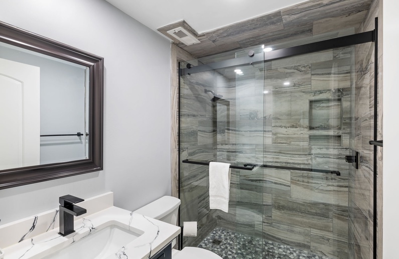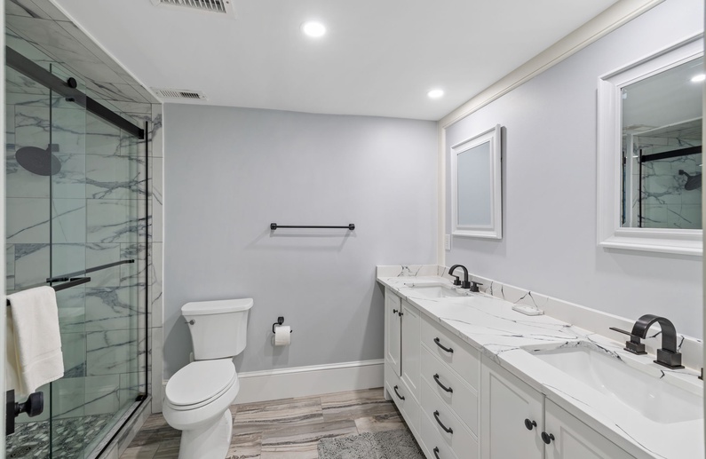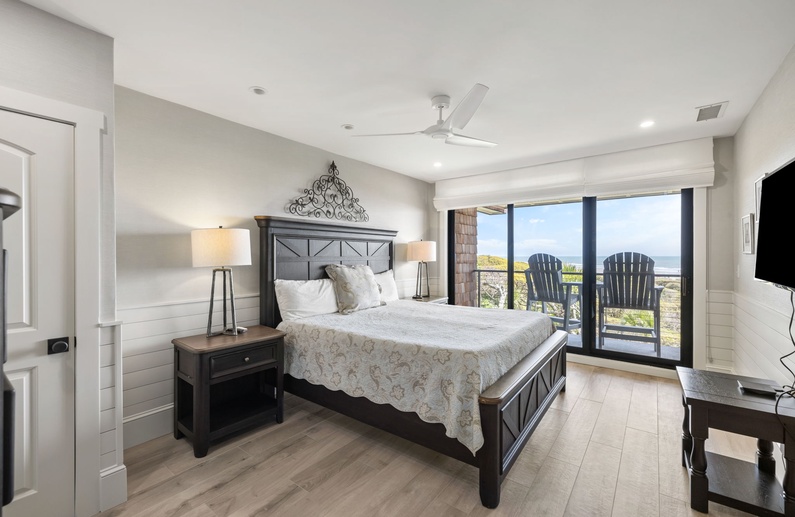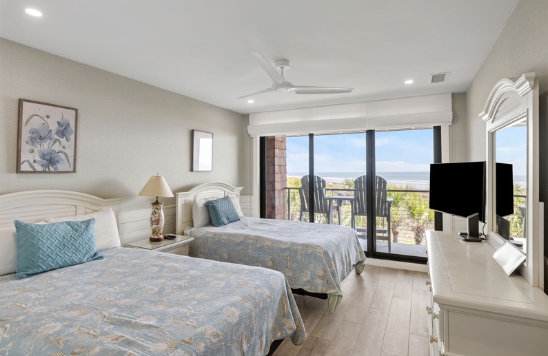 The primary bedroom features a king size bed, flat screen television and an attached en suite bathroom. The bathroom delivers a luxurious feel, with black finishes and a striking black and white contrasted dual vanity, plus a walk in shower. The primary bedroom also offers access to the oceanfront balcony. A secondary bedroom highlights two queen beds, access to the large oceanfront balcony and an additional full bathroom. The second bathroom also features black and white finishes and a beautifully remodeled walk in shower.