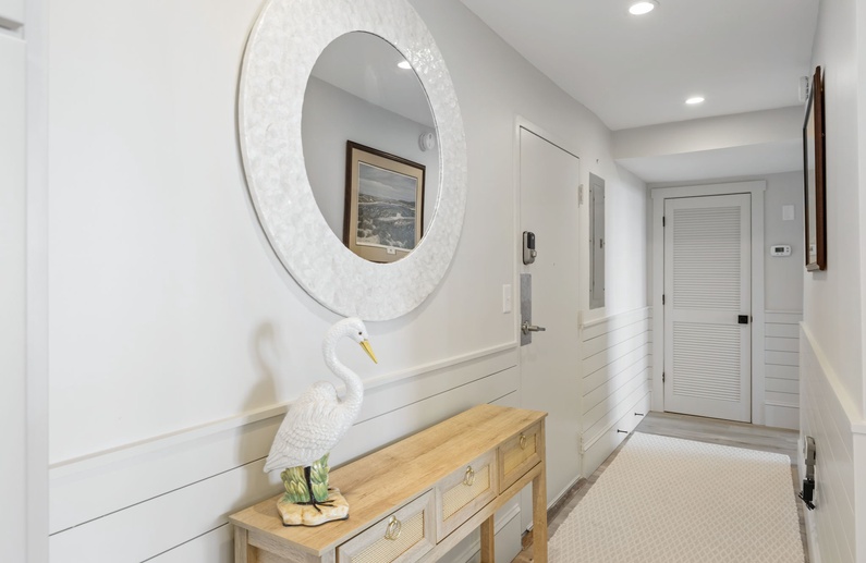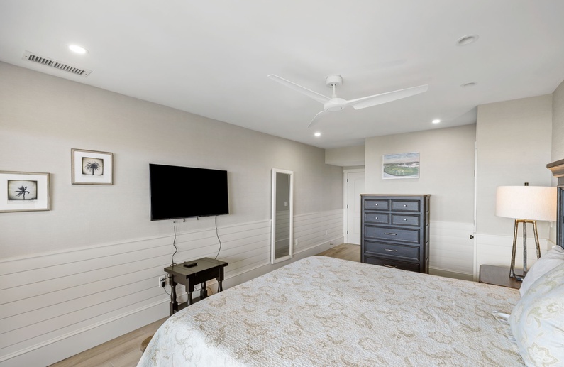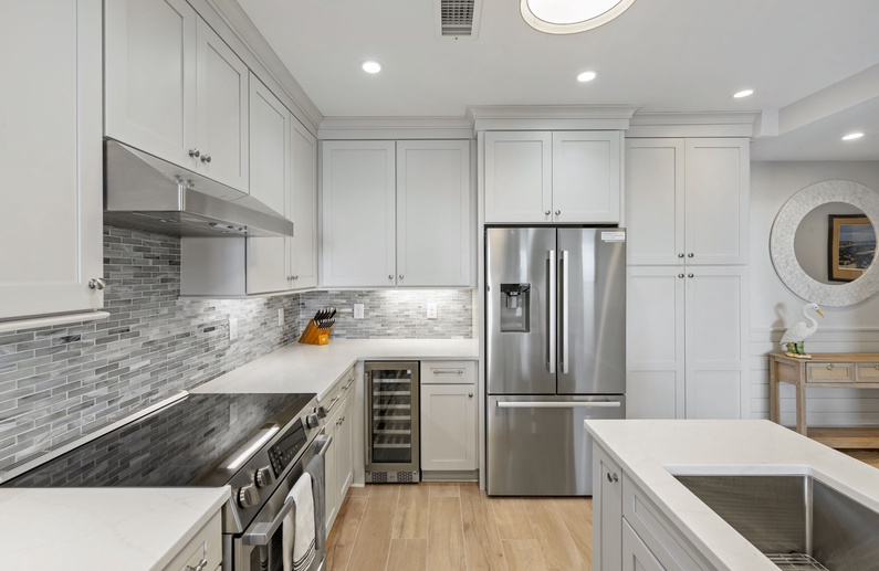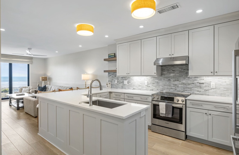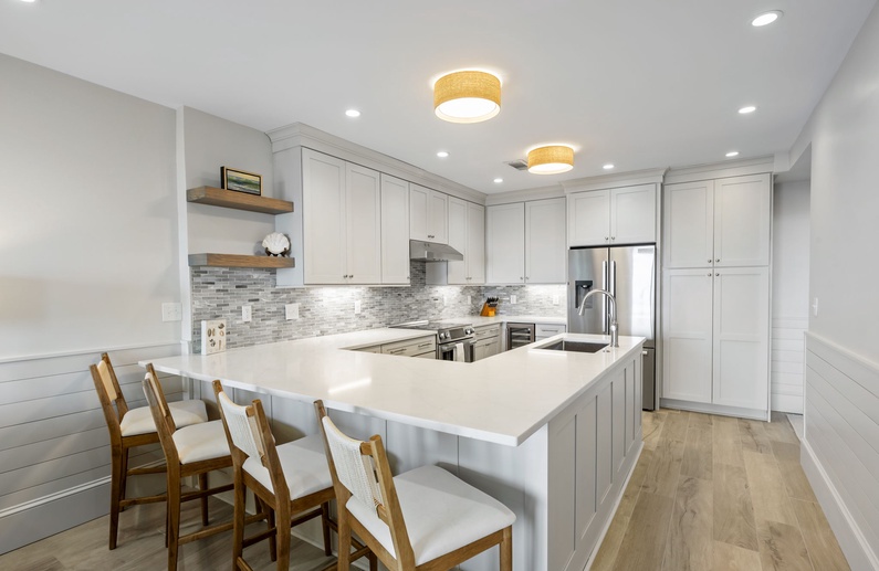 Just steps from the beach, this newly renovated villa offers refined interiors and a comfortable living space. As you enter you’ll be greeted by a stunning gray shiplap wainscoting that leads you into the fully equipped kitchen. Crisp white cabinetry are accompanied by sleek white countertops and a striking backsplash to convey a modern feel, and stainless steel appliances are seamlessly integrated for both style and functionality. Seating for 4 is at the end of the large island bar/countertop.