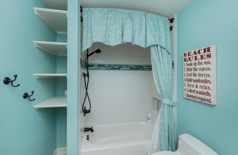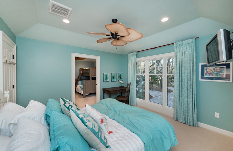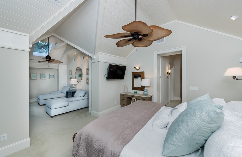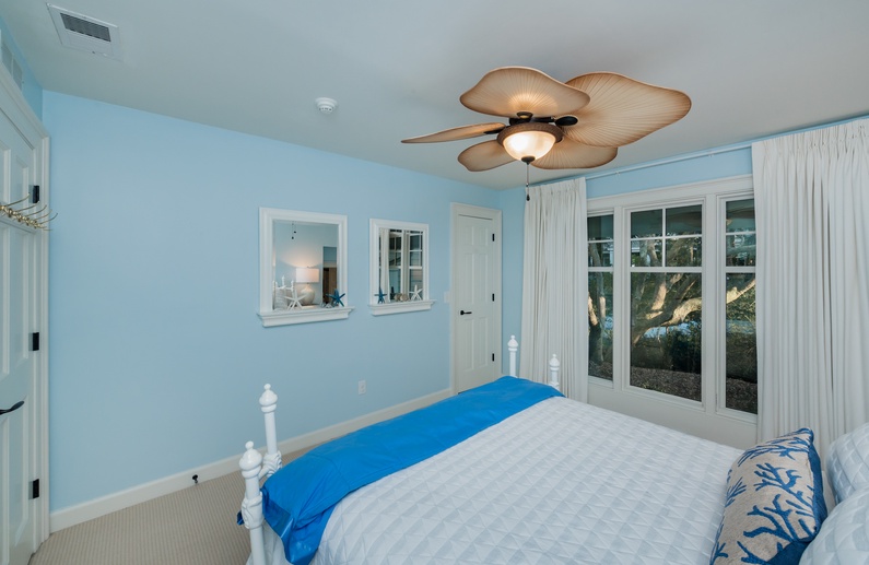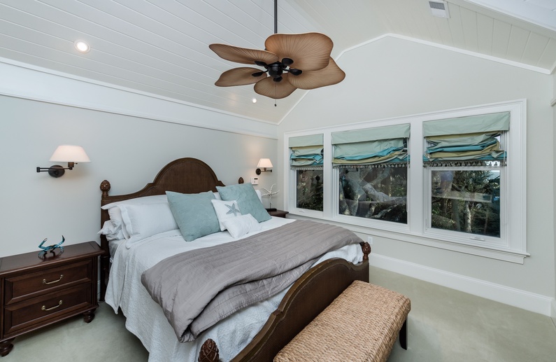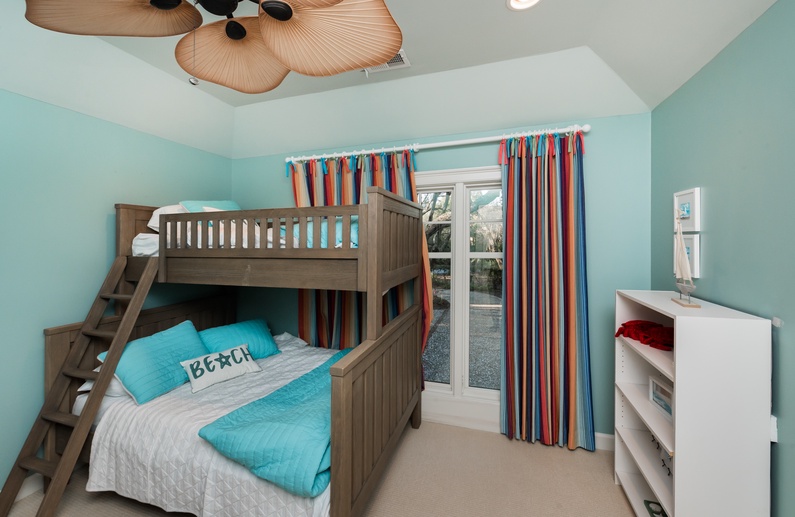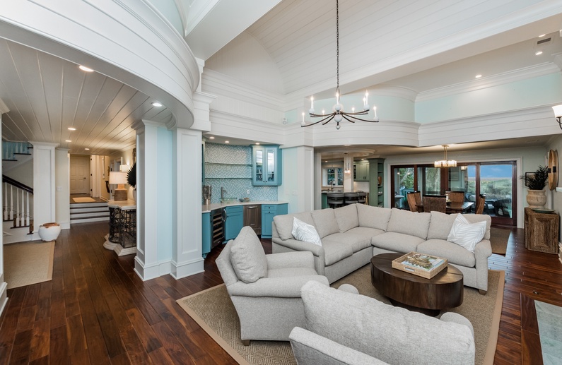 Walk through the welcoming door right into the heart of the home and immediately notice the beautiful hardwood floors, the built-ins, amazing ceilings, and coastal theme. The main living area offers a large mounted flatscreen TV, a L-shaped sofa, and two chairs. Grab a refreshing drink from the wet bar with a wine cooler and separate ice maker. The large kitchen features stainless steel appliances, plenty of counter space, bar stool seating for 4 at the island, and is equipped with everything needed to enjoy a meal while on vacation. The dining room comfortably seats 6 for meals but has 2 leaves with 2 additional chairs that can be added. Enjoy the extra living space in the screened porch with plenty of comfortable seating and a nearby gas grill. 4 out of the 5 bedrooms are also on this level. A king bed with nearby bathroom, queen bedroom with private access to a hall bathroom, and a parent-child suite featuring a queen bedroom and a bedroom with twin-over-full bunk beds share a bathroom. Head upstairs to the spacious primary suite which features a king bed, sitting area, private bathroom, and access to the deck with ocean views.