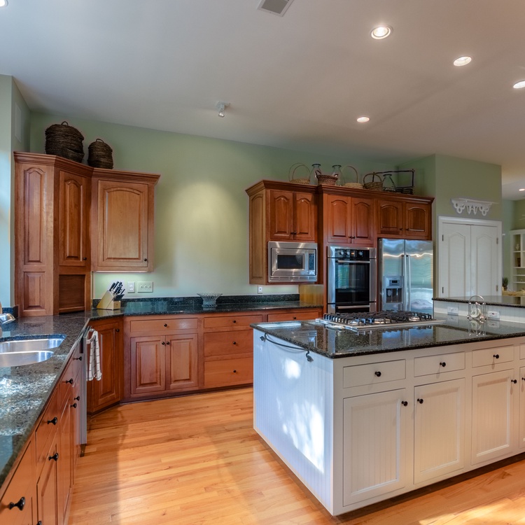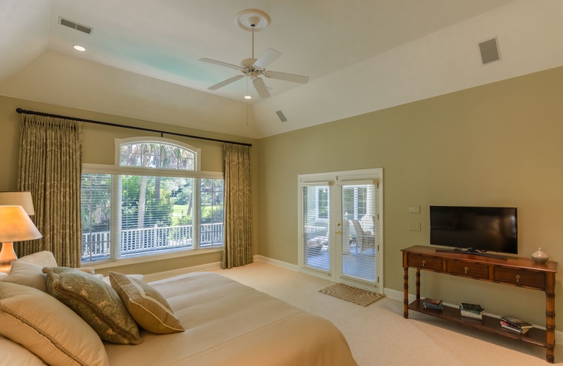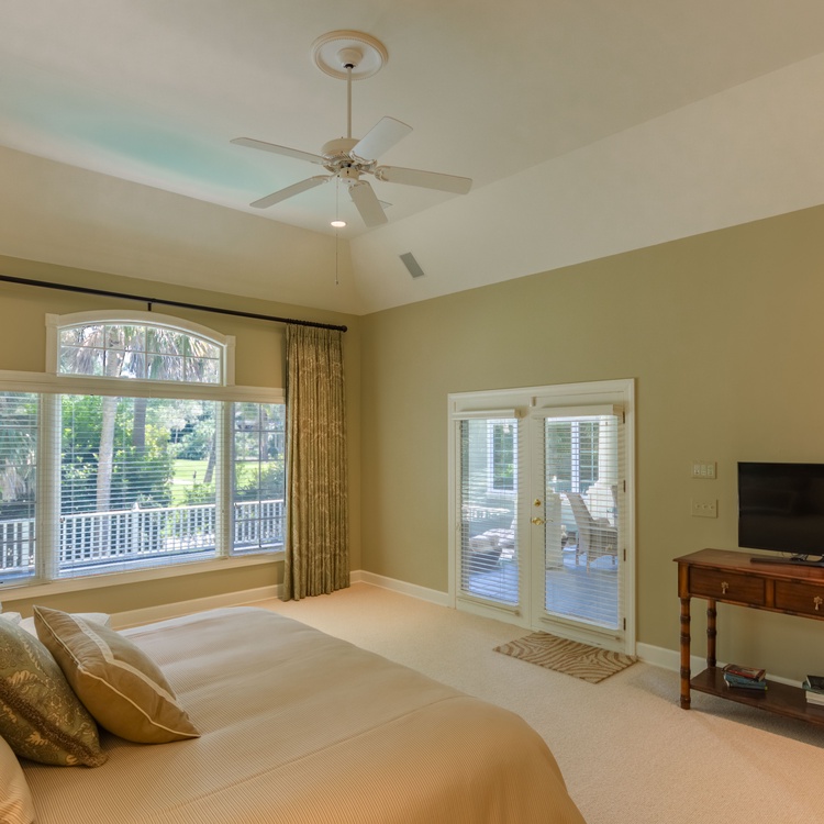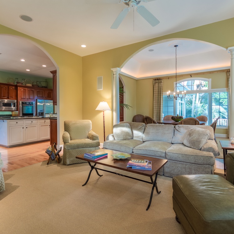 Accentuated by hardwood floors, stately columns, and arched windows, the main living room is centrally located in the home and has easy access to the back deck. The fully equipped kitchen offers a large center island with bar stool seating. Just off the kitchen, the dining room and den have picture windows offering views of the golf course. The den will prove to be the main gathering space with its ample seating, wall-mounted flat-screen TV, and close proximity to the kitchen.