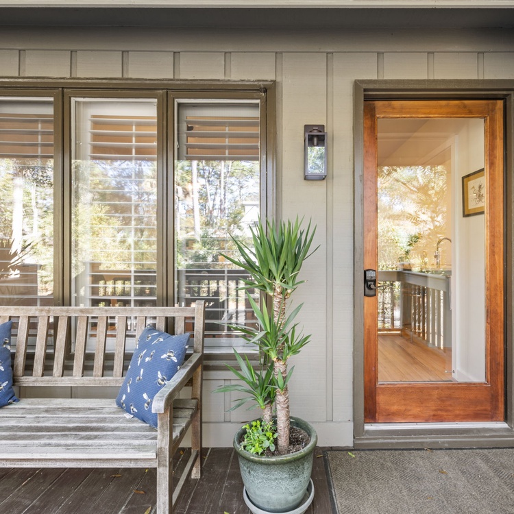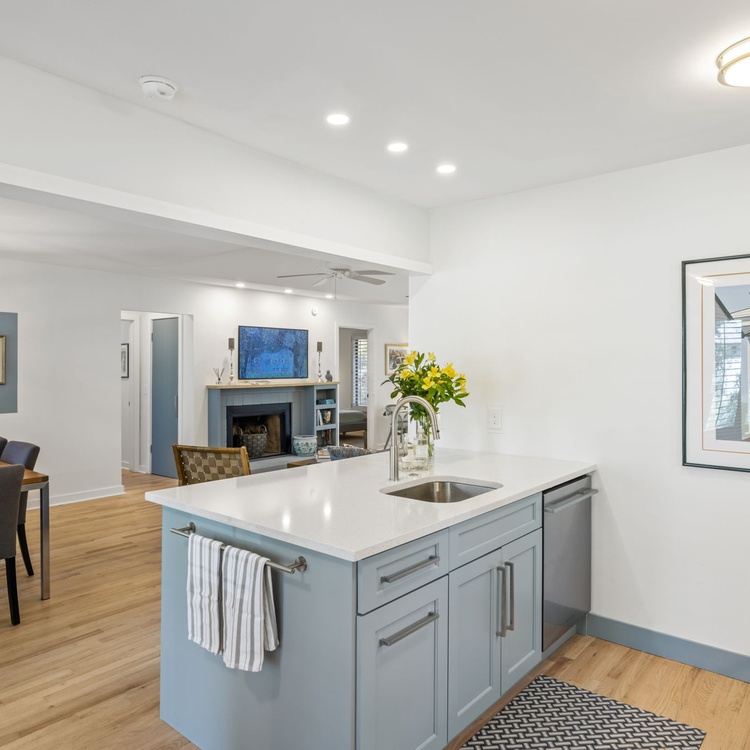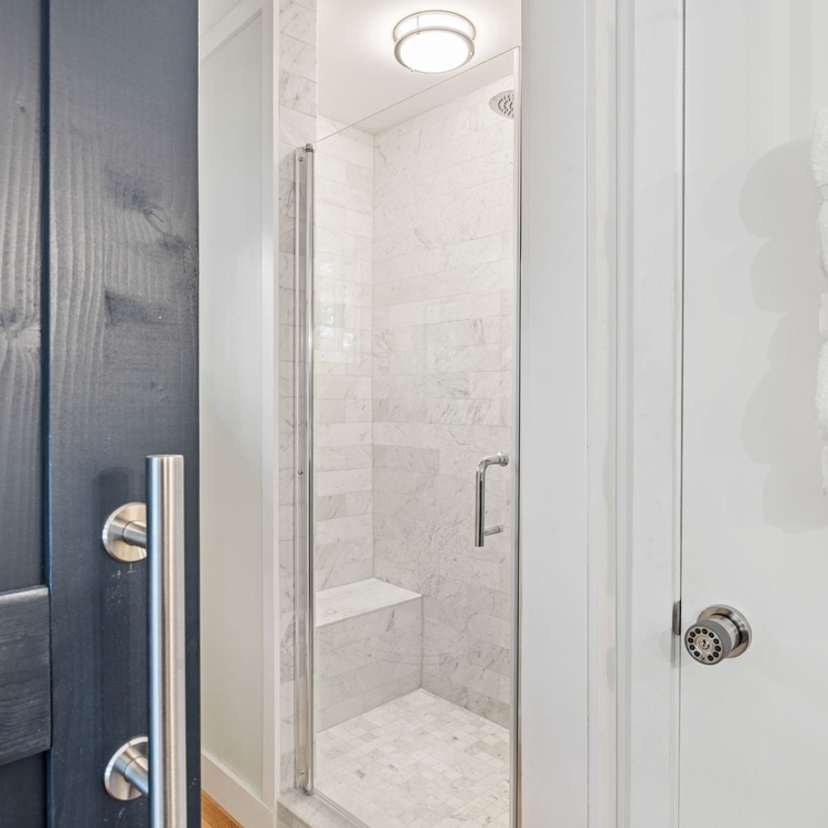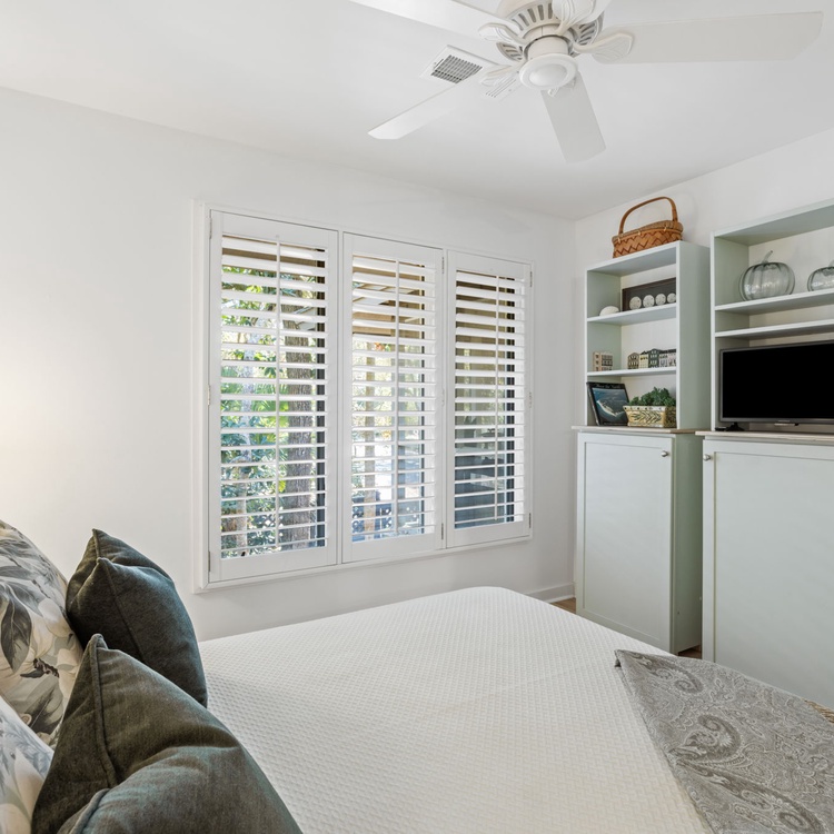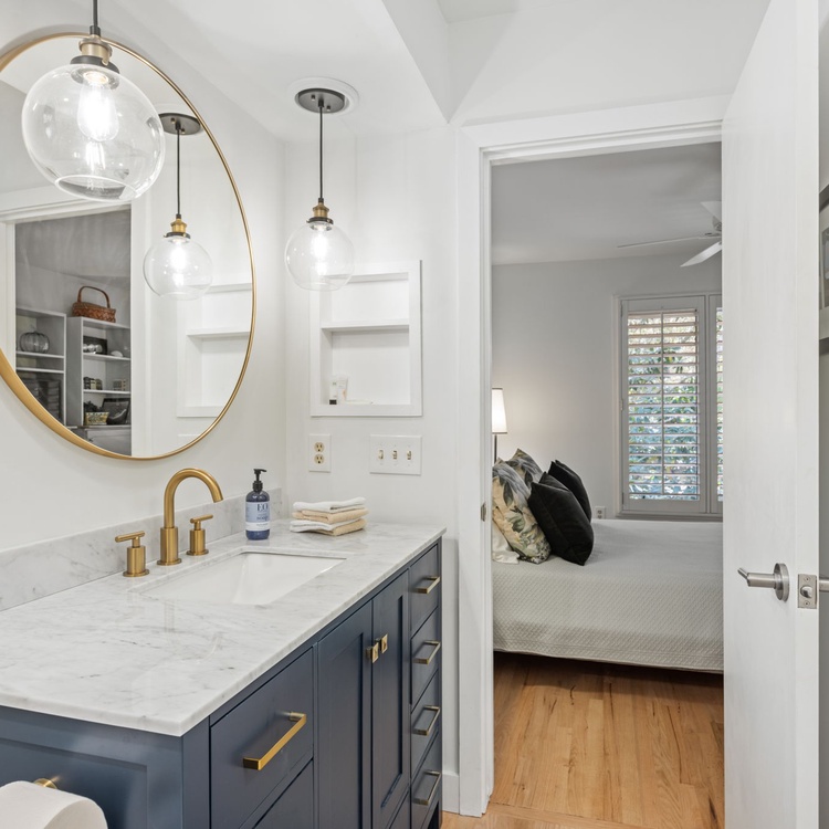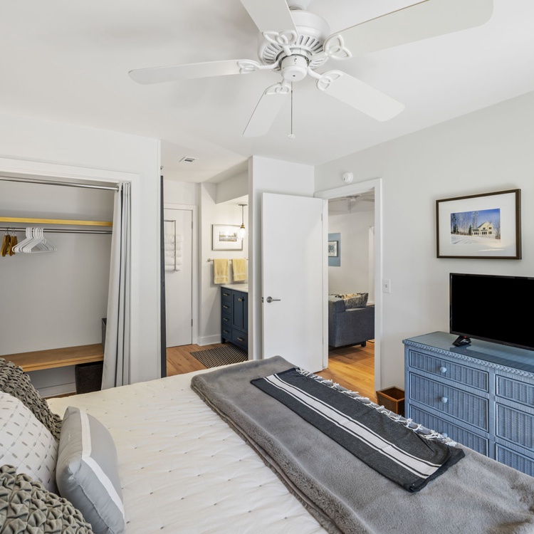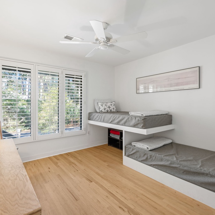 Great for family getaways, this cottage features a king bedroom with a smart TV, a fully renovated bathroom with a walk-in Carrara marble tiled shower, and direct access to an outdoor deck. Two additional bedrooms, one with a queen bed and one with built-in twin beds, also each feature smart TVs. The twin bedroom, which can double as a home office, includes a unique under-bed space for kids’ play or luggage storage. These bedrooms share the second bath with a shower/tub combo and a striking navy blue vanity. A new laundry area, with full-size side-by-side washer and dryer and a generous counter for laundry folding or storage, completes the set-up.