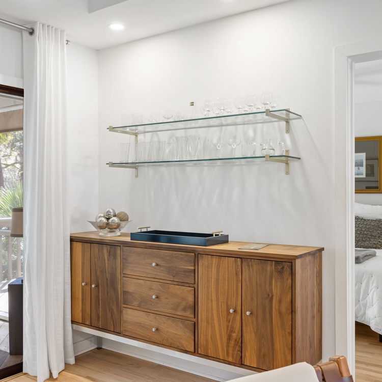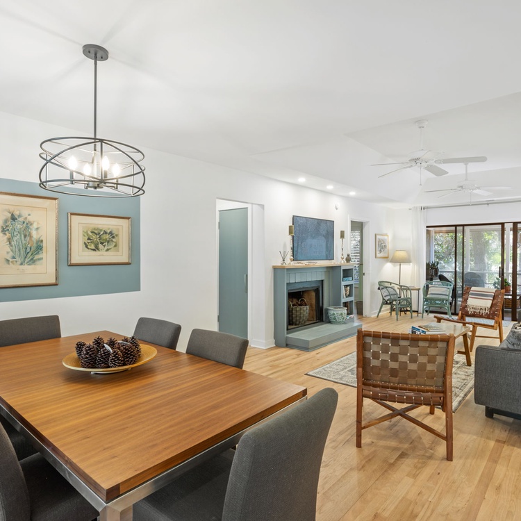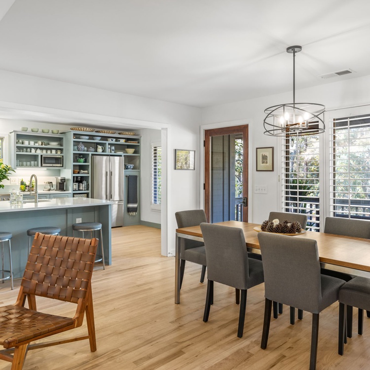 Modern, stylish decor with beautiful natural oak floors throughout welcomes you into this Kiawah Island cottage. The new (2023) kitchen, featuring Fisher and Paykel appliances, quartz countertops, and open shelving, includes a wide peninsula counter with stools and an open view of the living area from the kitchen sink. A café table and chairs for morning coffee and a convenient drop station where guests can hang jackets and beach towels and stow extra gear complete the kitchen area. The living room has all new furnishings, a picture frame smart TV, a bar area, and access to the screened porch. Open to the living space and kitchen, the adjacent dining area is the perfect place to enjoy your vacation meals and offers seating for six guests (or even more with the available leaf).