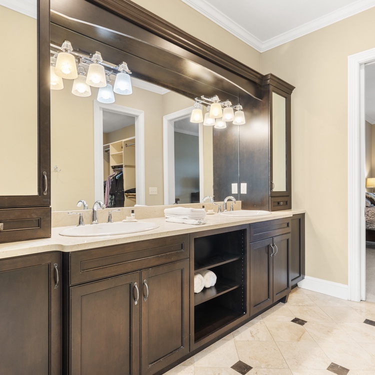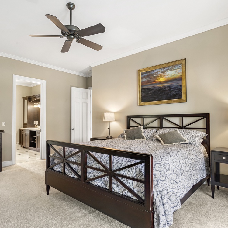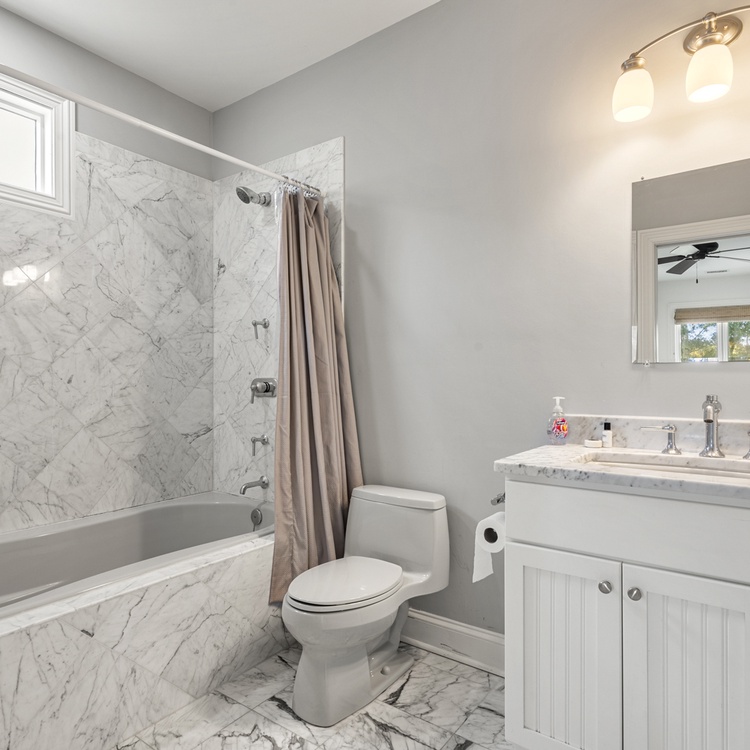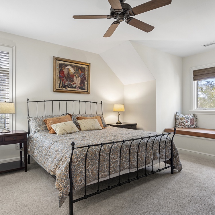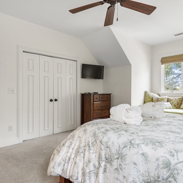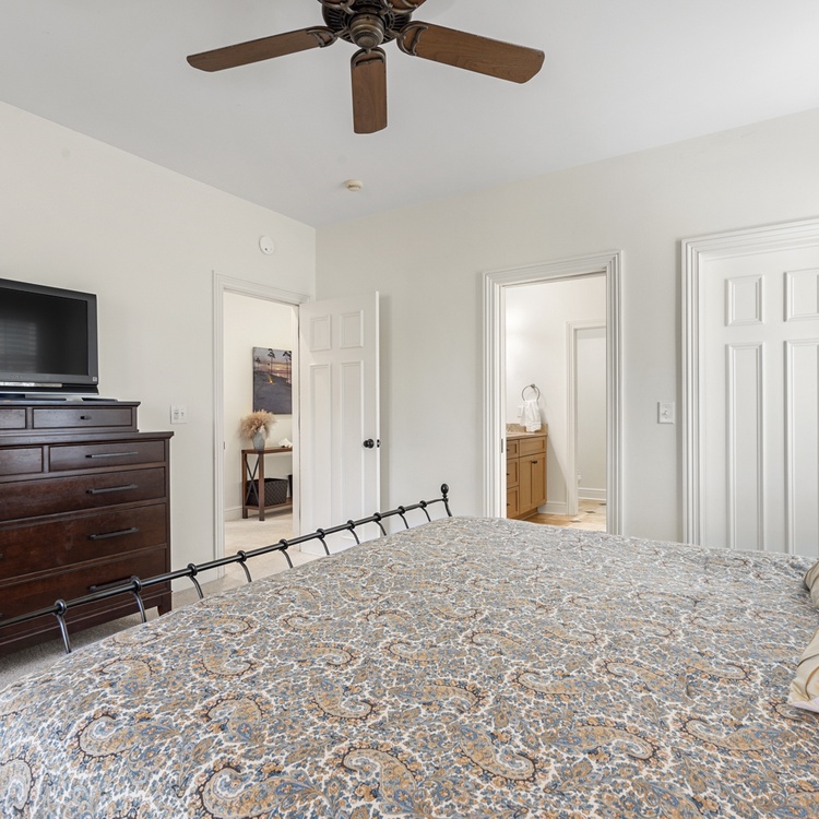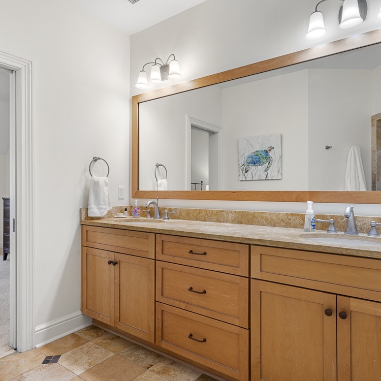 The first bedroom, one of two primary suites, is located on the main floor and boasts a king-sized bed, TV, and access to the deck. A retreat in itself, the en suite bathroom features a soaking tub, walk-in shower, and dual-sink vanity. Upstairs, you will find the remaining three bedrooms. The second primary suite has a king-sized bed, TV, cozy window seat, and a private bathroom with a walk-in shower and dual-sink vanity. Along with a balcony overlooking the pool, the third bedroom has two full beds and convenient access to the hall bathroom with a walk-in shower. The final bedroom offers a queen-sized bed, TV, and private bathroom with a shower/tub combo.