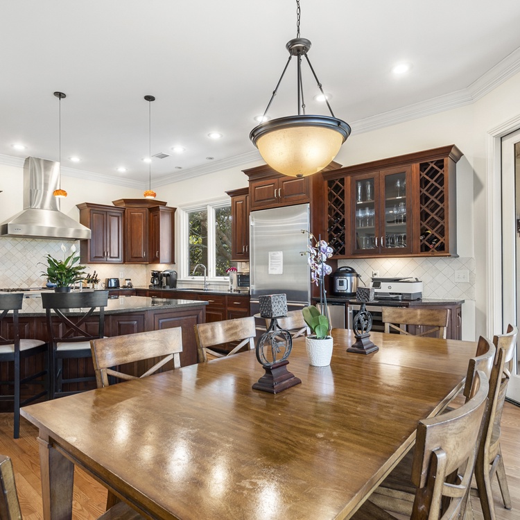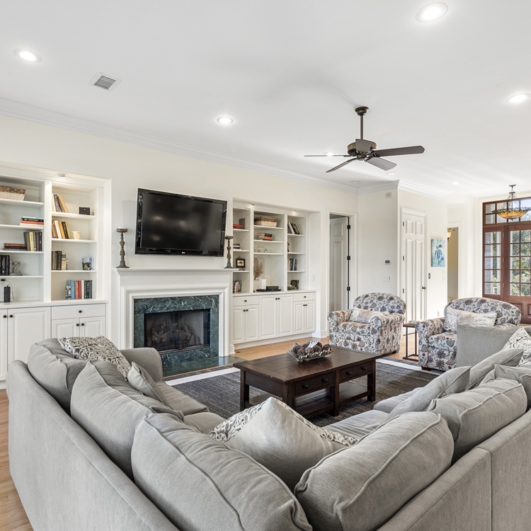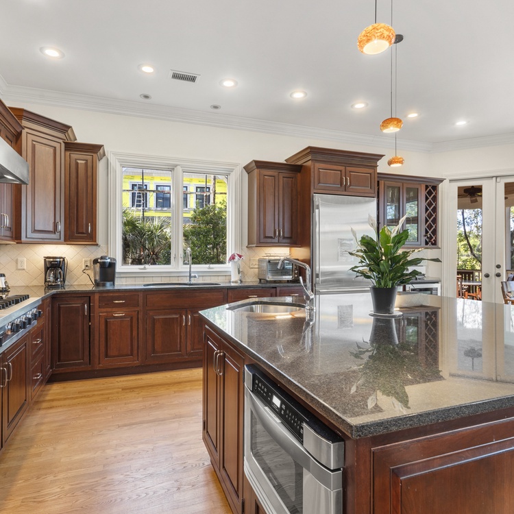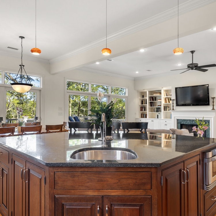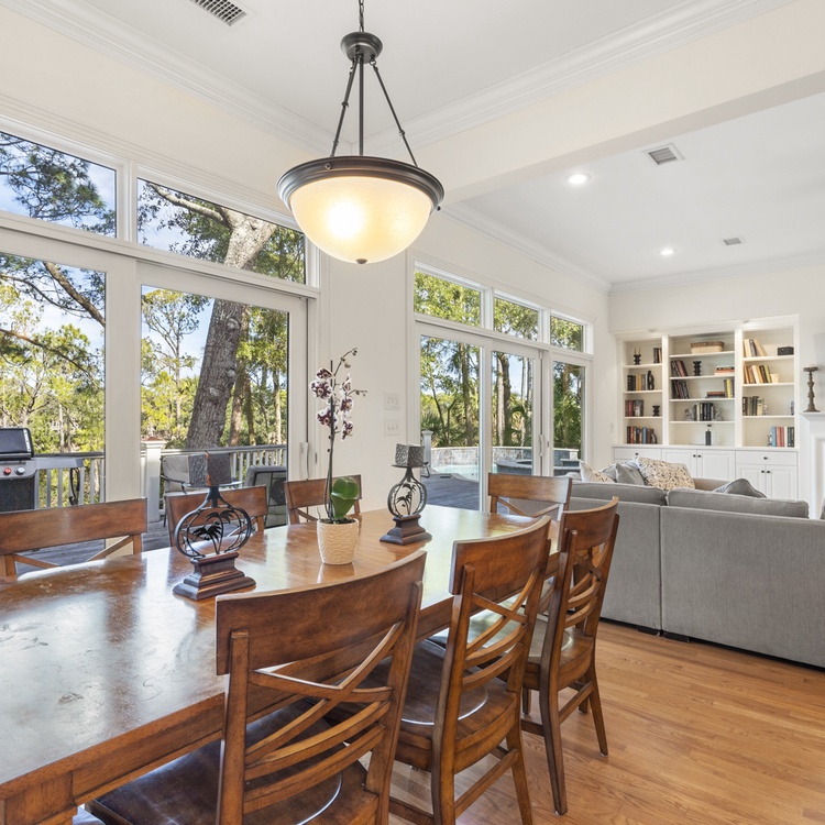 Located behind Kiawah Island's second gate in the Vanderhorst section, this home is situated on a quiet cul-de-sac and is surrounded by natural beauty. An open floor plan with generous living spaces provides plenty of space to gather during your stay. Great for relaxing after days spent poolside, the spacious main living area offers a comfortable sectional sofa and a wall-mounted TV. A second living area, or study, offers a sleeper sofa and TV. Prepare your vacation meals and snacks in the exquisite gourmet kitchen, complete with a Viking double convection oven, Sub-Zero refrigerator, marble countertops, and ample prep space. The adjacent dining table is perfect for enjoying meals together or playing board games with your group.