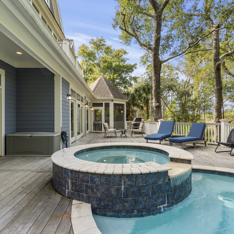Private pool and spa! Enjoy time outdoors on the home's back deck or breezy screened porch. The large back deck is an outdoor oasis that houses a swimming pool, spa, grill, and lounge seating. Dine al fresco, read the morning paper, or simply relax on the peaceful screened porch.