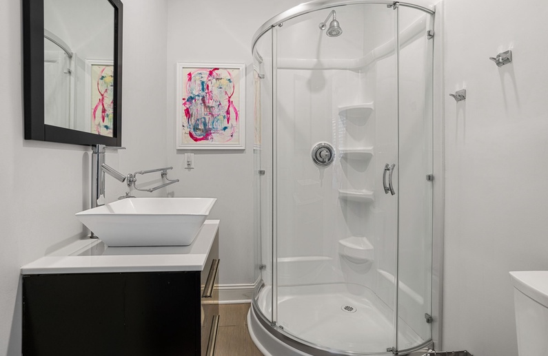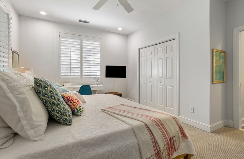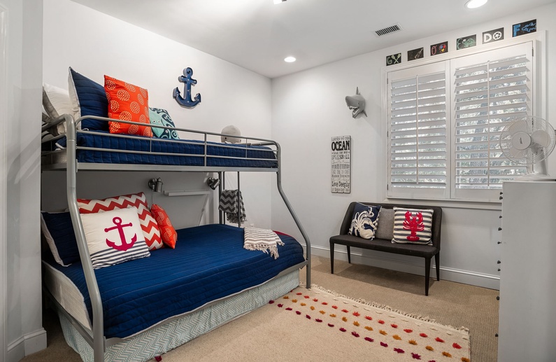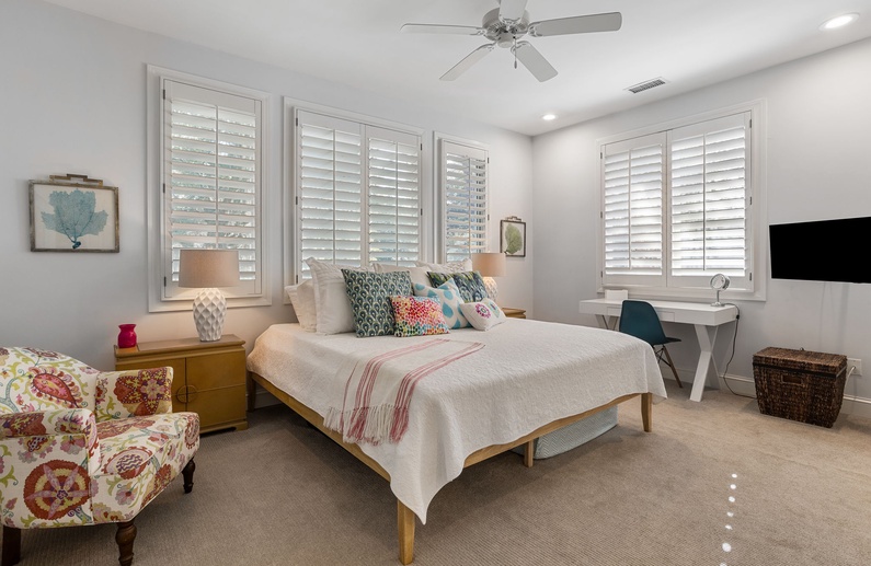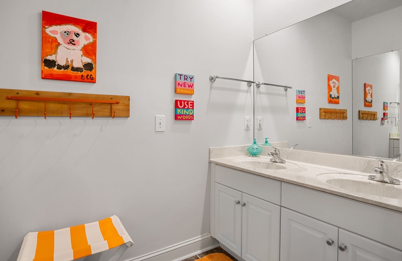 When it's time to rest, three comfortable bedrooms are designed to ensure a peaceful and rejuvenating sleep. The primary suite offers a king-sized bed, a TV, and an en-suite bathroom with a dual-sink vanity and a walk-in shower. The second bedroom also features a king-sized bed, a TV, a desk for any work needs, and its private bathroom with a walk-in shower. Ideal for kids or friends, the third bedroom includes a twin-over-full bunk bed, a TV, and a private bathroom with a shower/tub combination.