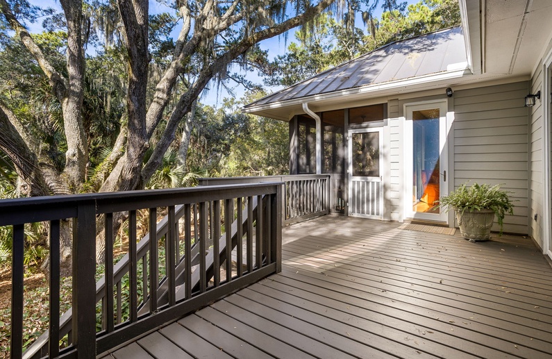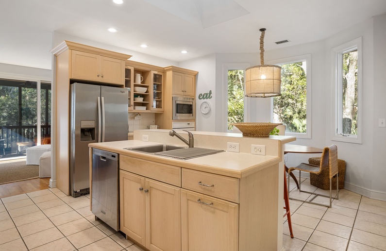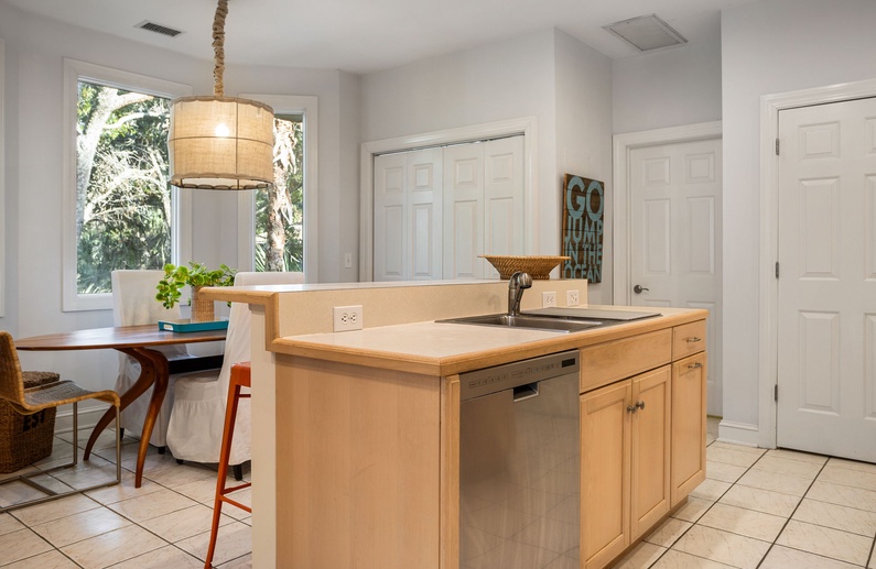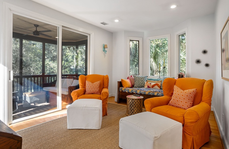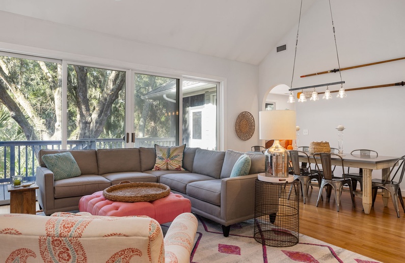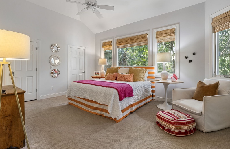 This inviting Kiawah Island vacation rental home boasts three bedrooms, a vibrant color scheme, and outdoor living spaces to enjoy. The home is located on a quiet street in West Beach and about a 4-minute bike ride from the beach.