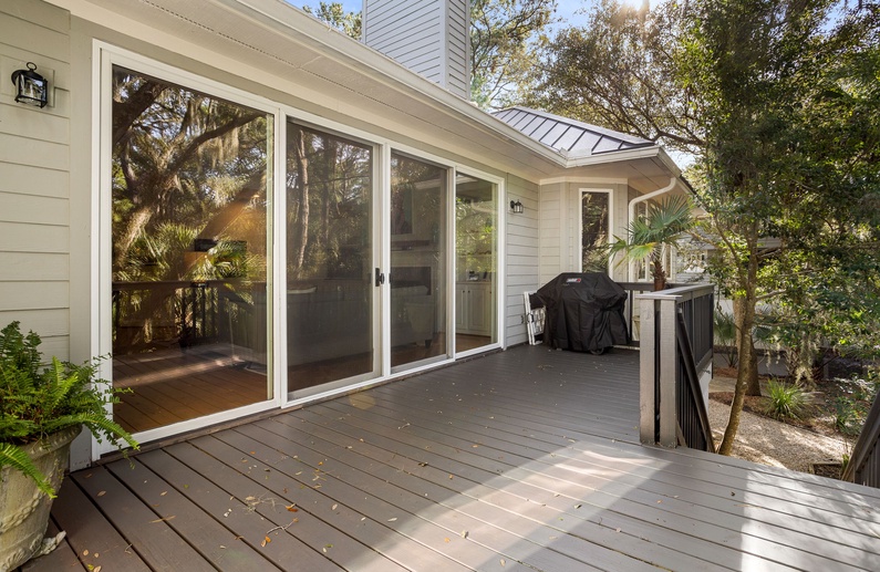 Outside, guests are invited to enjoy the home's screened porch and deck area. The porch is a cozy haven with comfortable seating, perfect for relaxing evenings, while the deck includes a gas grill for delightful outdoor meals.