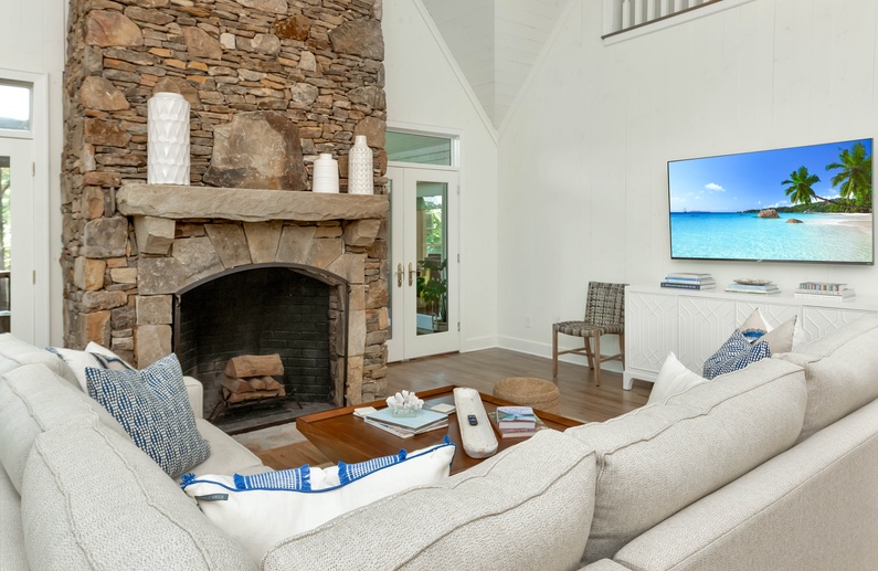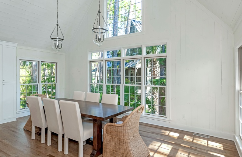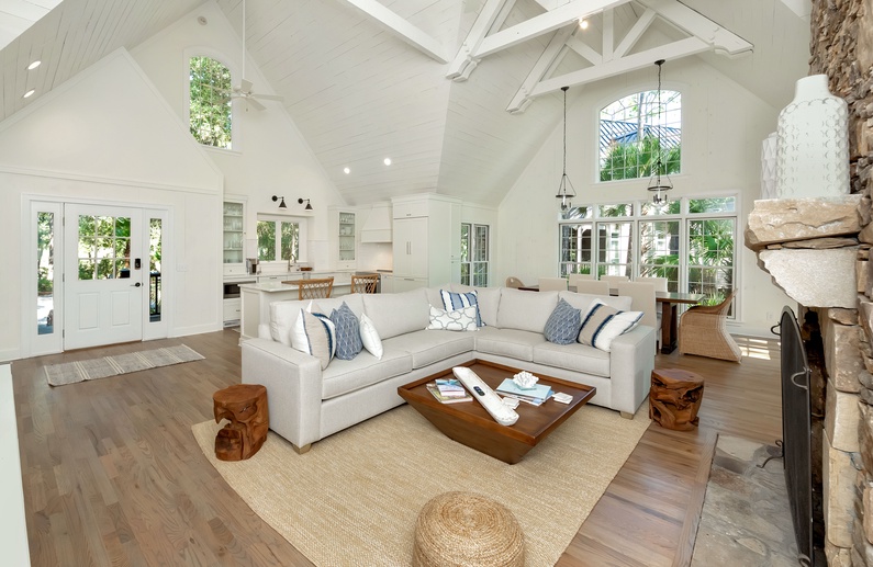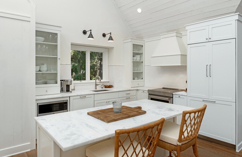 The completely renovated home features an abundance of natural light and soaring ceilings. Find everything you need for cooking meals in the open kitchen. The gourmet kitchen boasts top-of-the-line appliances, a wine cooler, marble countertops, and a large island. Enjoy a meal in the dining area which includes a table with seating for up to 10. The living area features a comfortable sectional couch, perfect for relaxing or enjoying the flat-screen TV with streaming through Hulu. The spacious screened-in porch, which can be entered from the living room, is the perfect place to unwind and take in the marsh views.