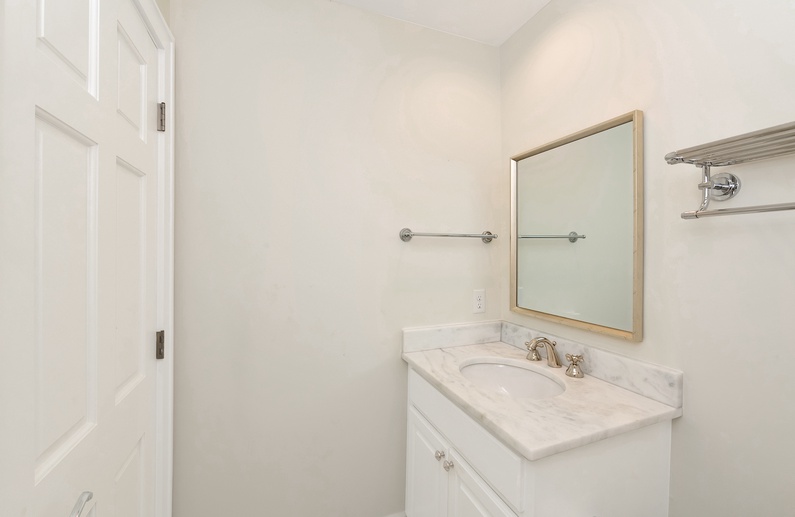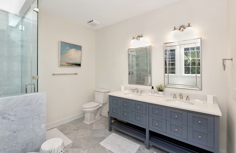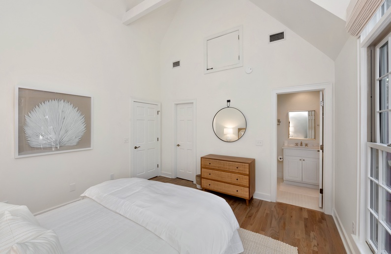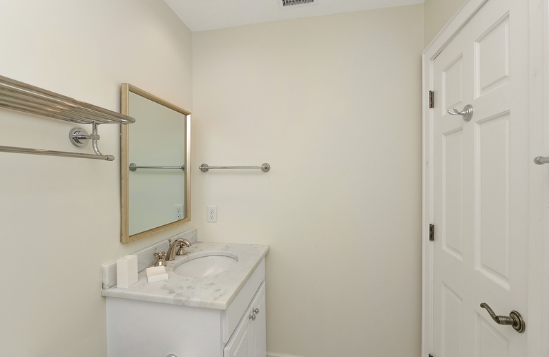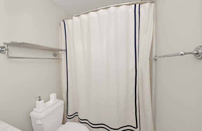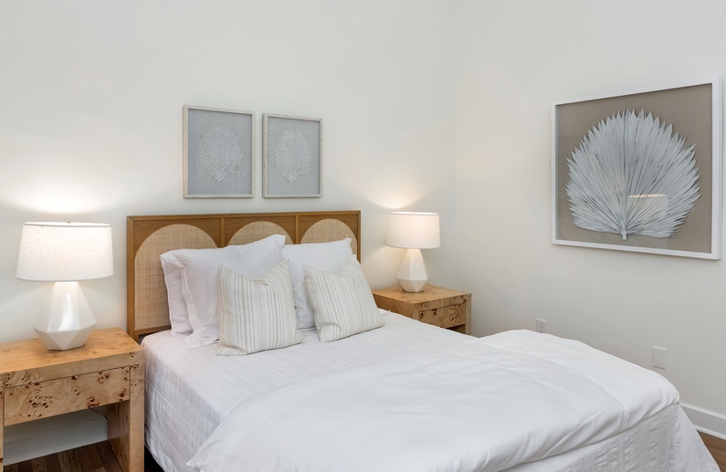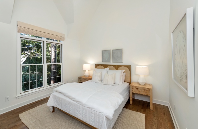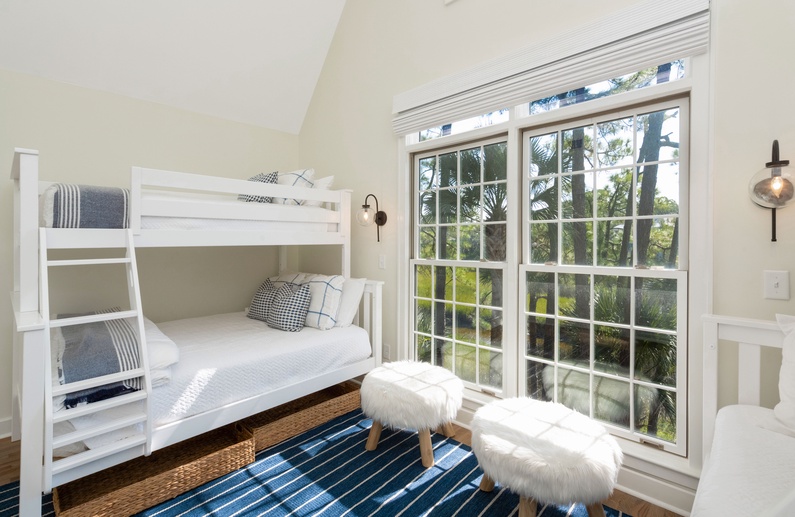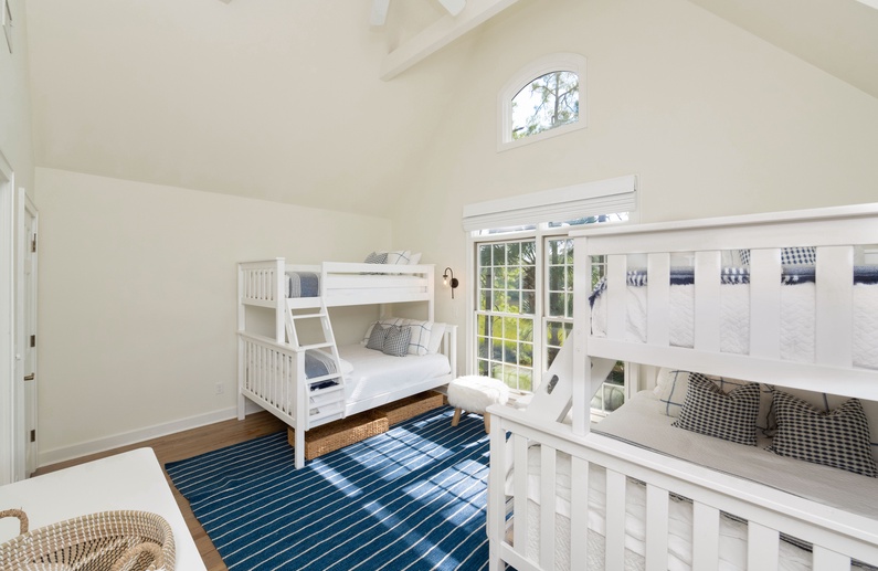 The first-floor primary suite features a king-sized bed, access to the screened-in porch, and a pristine ensuite bathroom with walk-in shower. On the second level, you will find two additional bedrooms. The first bedroom has a queen-sized bed and a private bathroom with a shower/tub combo. A second bedroom has two twin over full bunk beds and also contains a private bathroom with a shower/tub combo.