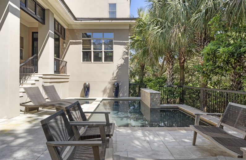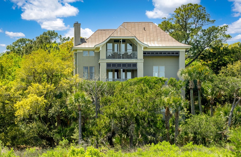 This Kiawah Island vacation rental features 5 bedrooms, a private pool and spa, stunning views of Bass Creek marsh, and a separate guest house. The home is about a 5-minute walk to the beach.