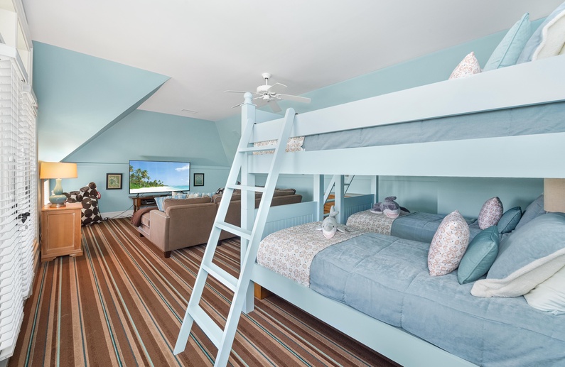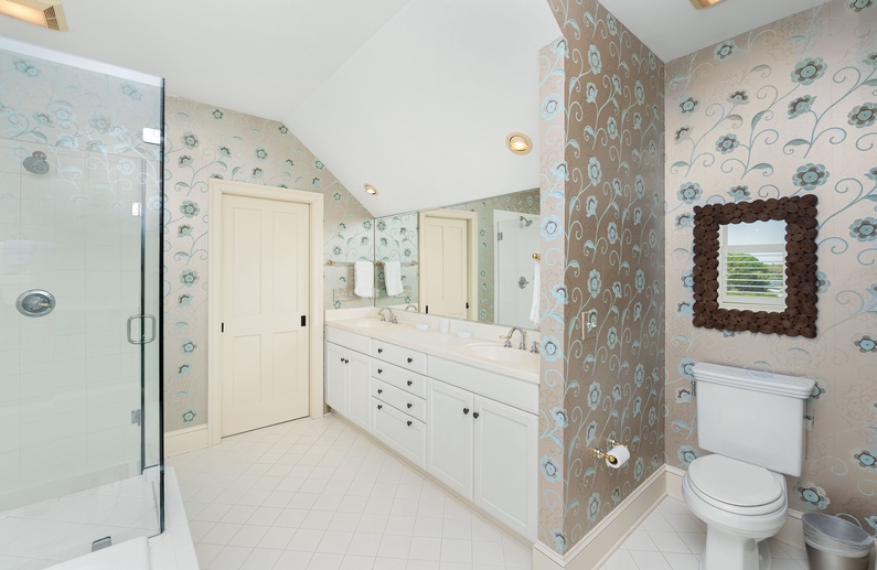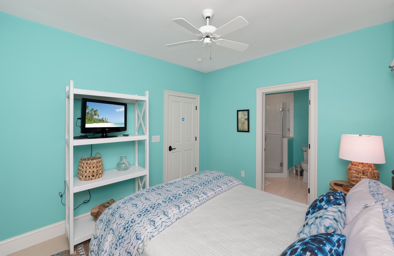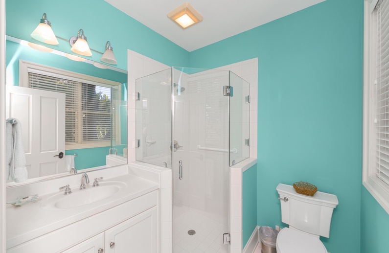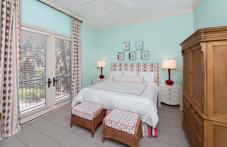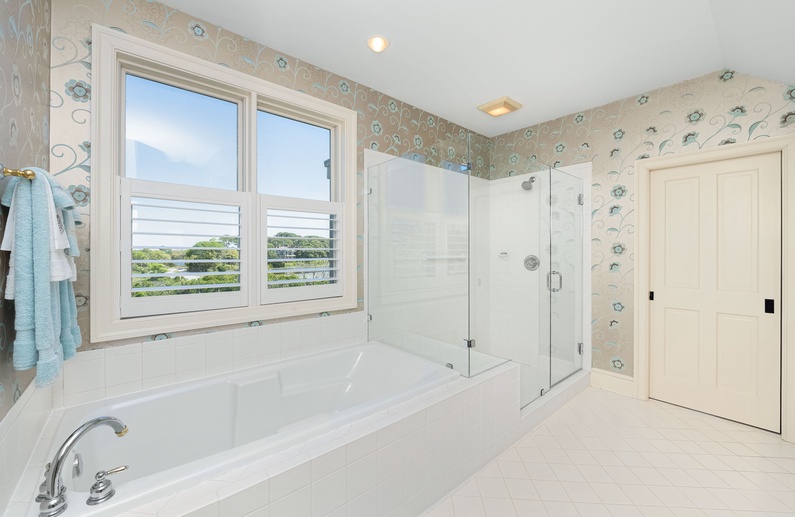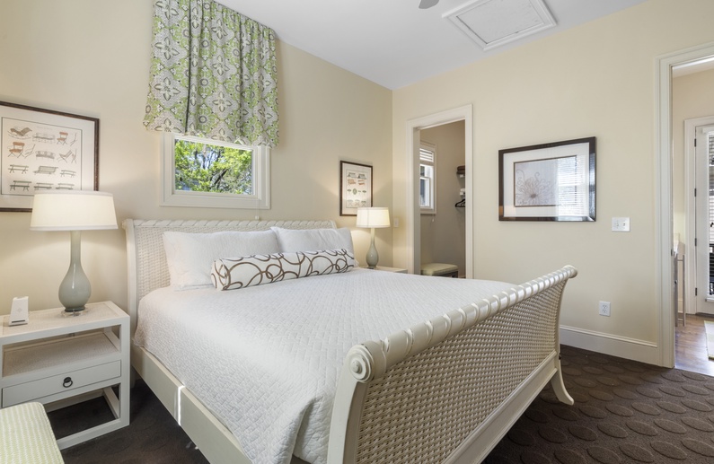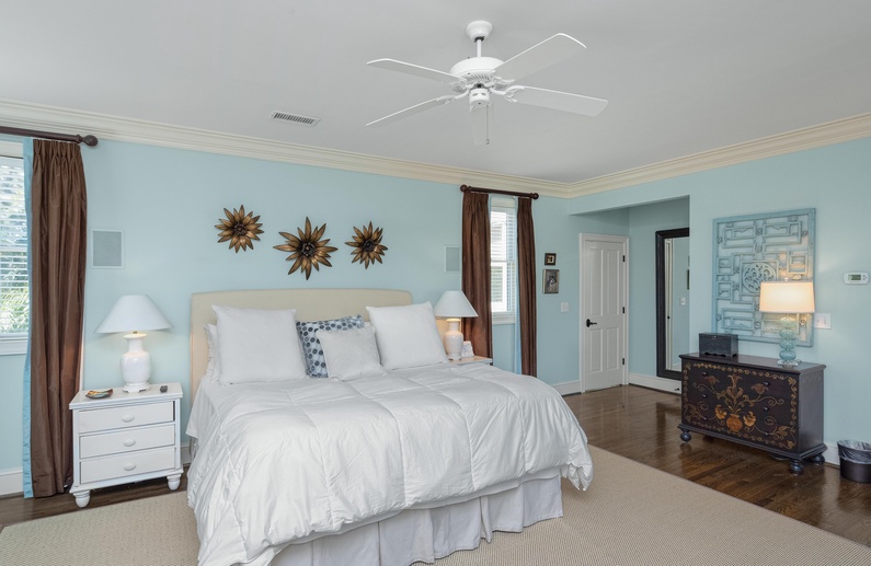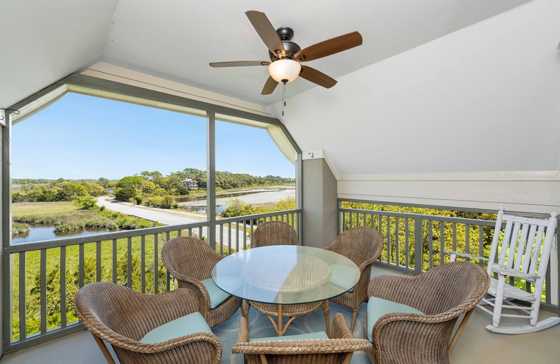 The first of the five bedrooms is located on the main floor and has a king-sized bed, private balcony, and attached bathroom with a shower/tub combo. The second-floor primary suite features a king-sized bed, a private covered porch overlooking the marsh, and a bathroom with a walk-in shower and garden tub. Also on the second floor is a coastal-chic queen bedroom offering a private bathroom with a walk-in shower. The third floor houses a bedroom with two twin-over-twin bunk beds, a sofa, TV, and access to a private balcony. The bedroom is across from a full bathroom with a walk-in shower. Along with a sitting area, kitchenette, and private balcony overlooking the pool, the guest house has a king bedroom and bathroom with a walk-in shower.