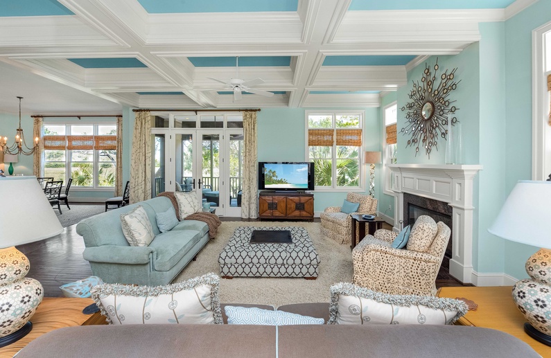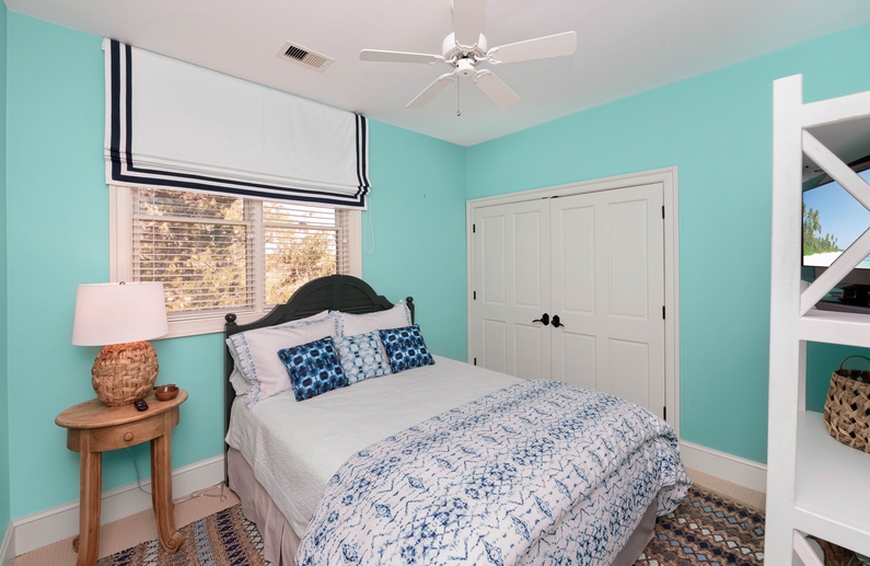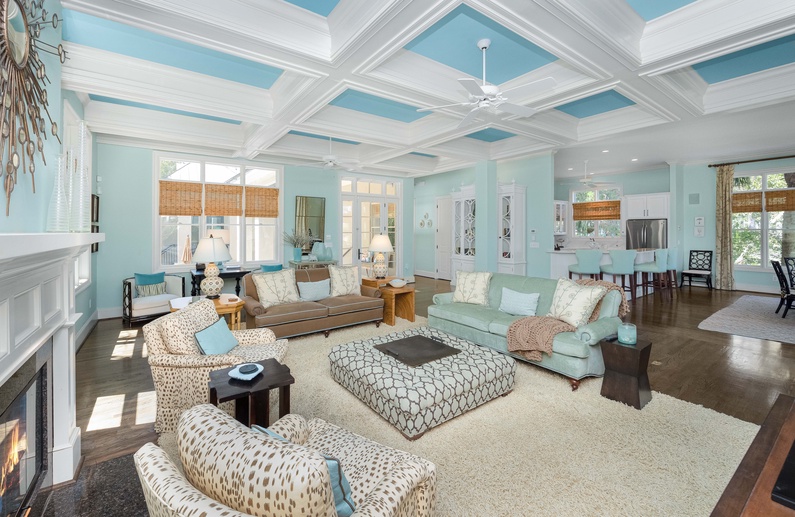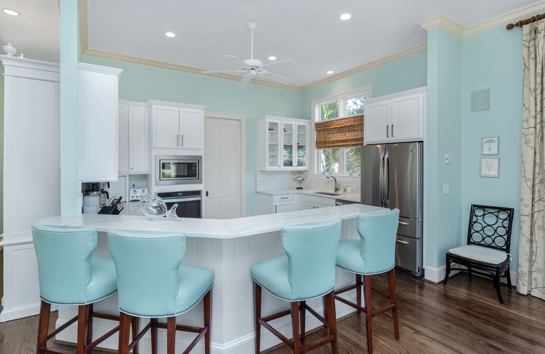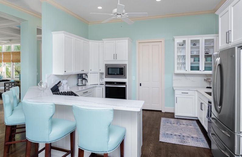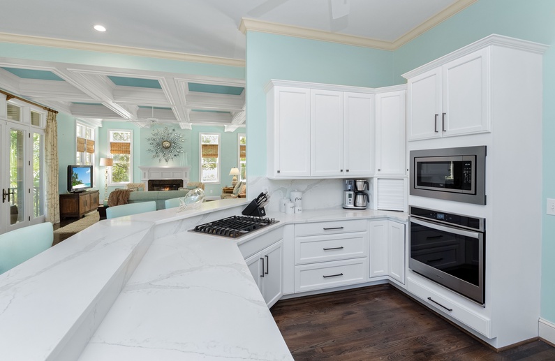 When you enter the home, you are welcomed by coffered ceilings, open living areas, and marsh views through the abundance of windows. An ideal place for gathering, the living room offers plenty of comfortable seating, a TV, and access to the screened porch. The dining area provides dining space for 8 with additional seating for 4 at the adjacent kitchen breakfast bar. The newly renovated kitchen boasts quartz countertops and backsplash, stainless steel appliances, and white custom cabinets.