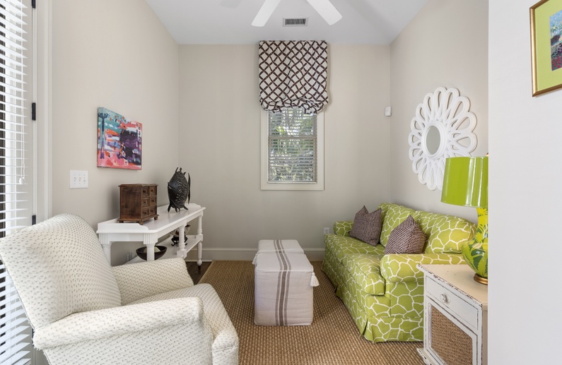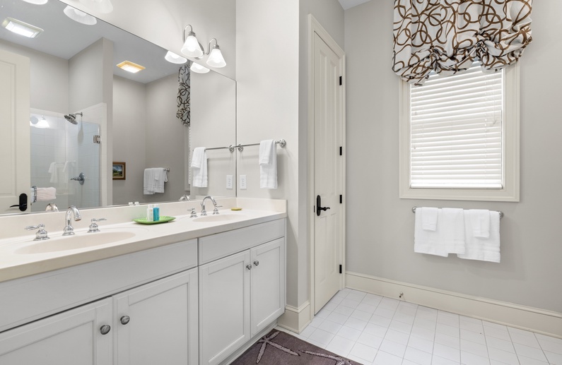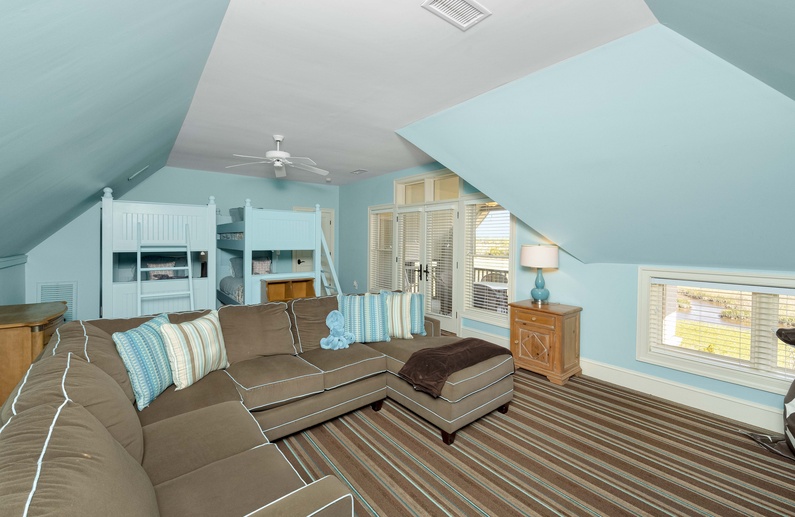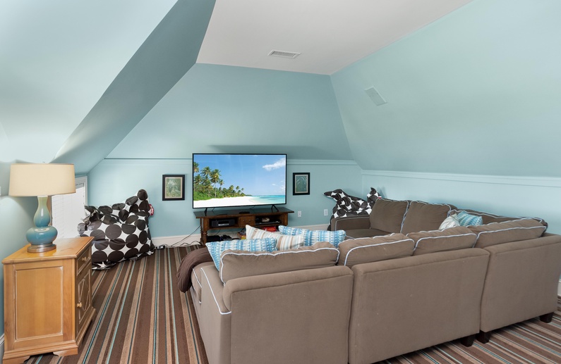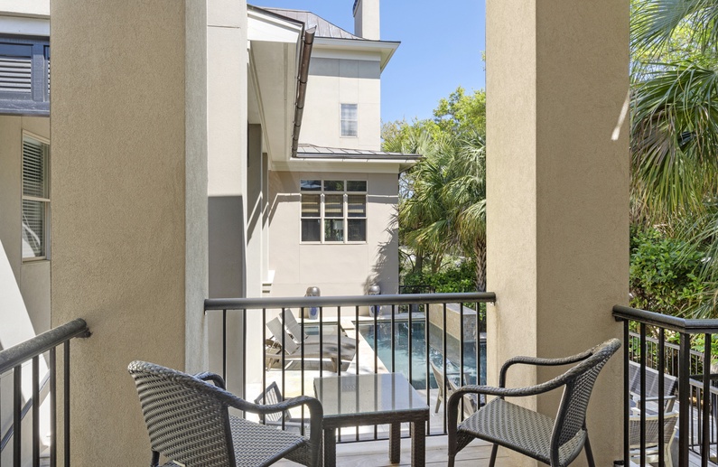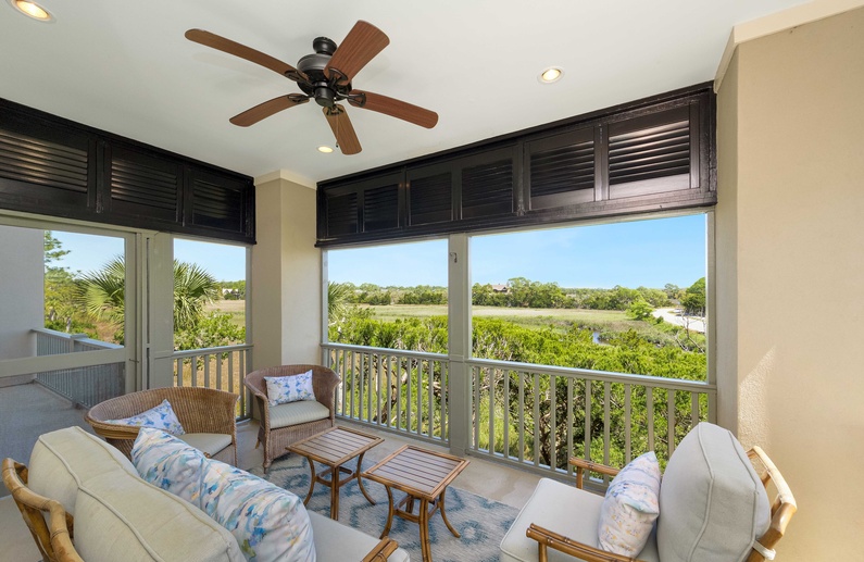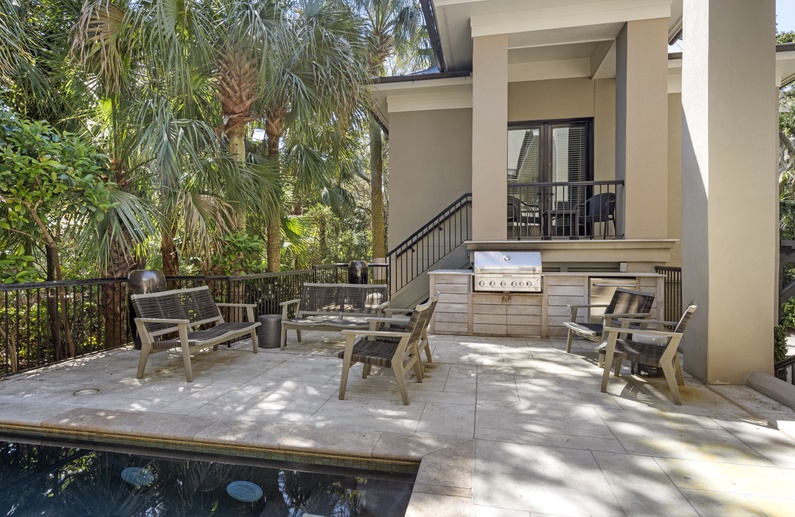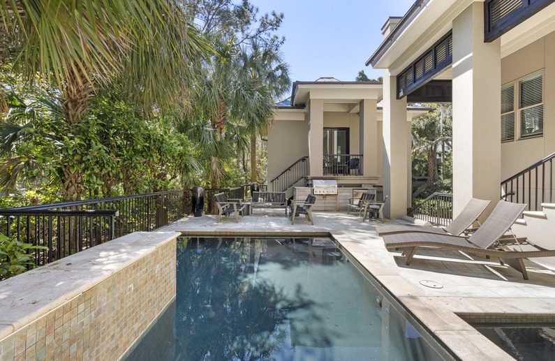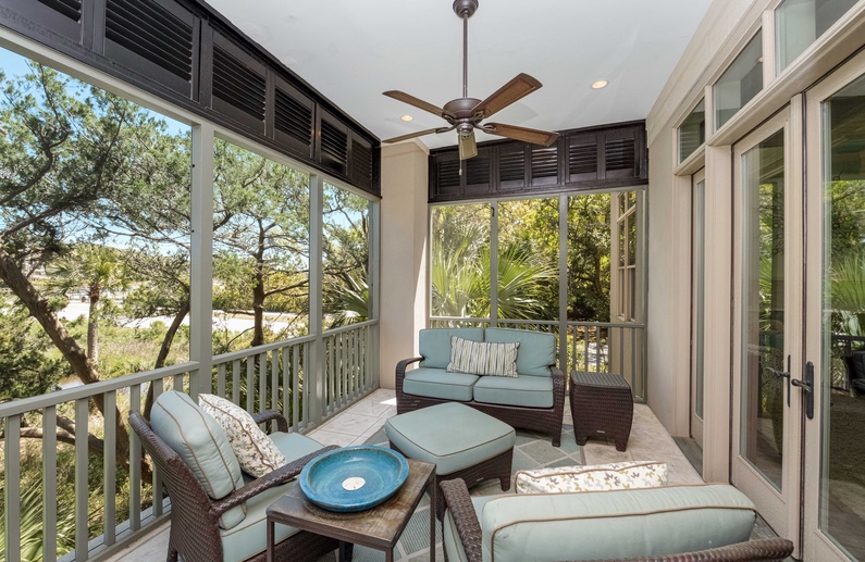 Guests will enjoy the abundance of outdoor living space. The generous pool deck includes a heated saltwater pool, spa, and grill station. In addition to the deck and three private balconies, the home also offers a screened porch.