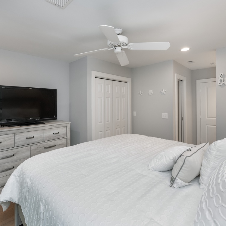 The primary suite features a king bed, TV, private updated bathroom with walk-in shower, and easy access to the back deck. There are two additional bedrooms, one with a full and full trundle bed and one with a full bed, that share an updated hall bathroom with shower/tub combo.
