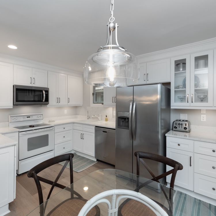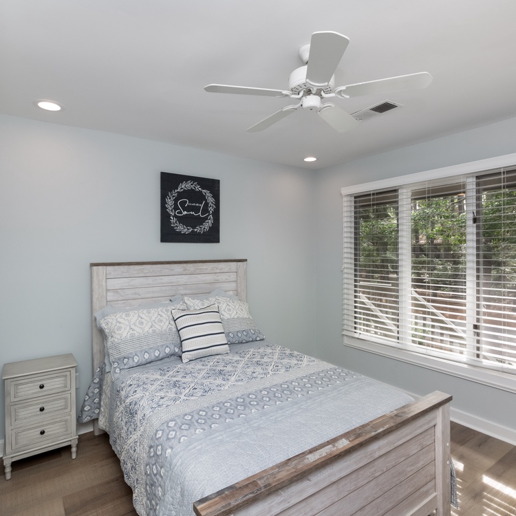 Featuring hardwood floors throughout, the cottage offers an open floor plan, plenty of natural light, and a coastal design theme. The living area features a cozy queen-size sleeper sofa, a large mounted flat-screen TV, and access to more seating in the light-filled space. The dining area offers seating for six and is a great place to enjoy a meal as a family. There is also a wet bar available for guests to enjoy. The kitchen showcases ample counter space, updated appliances, an eat-in table for four, and everything needed to cook a meal while on vacation.