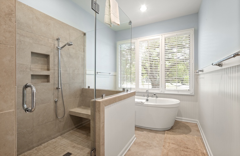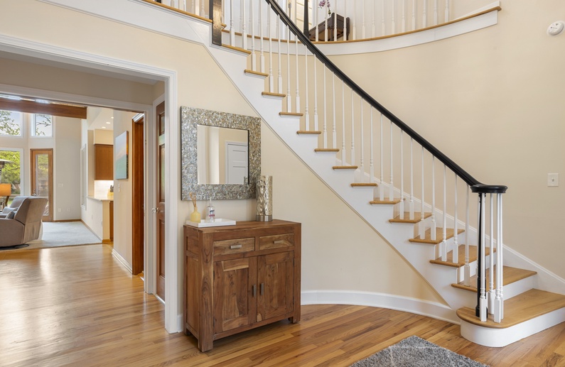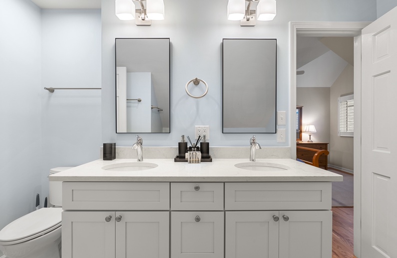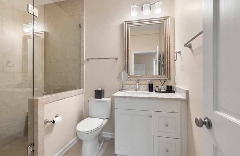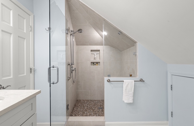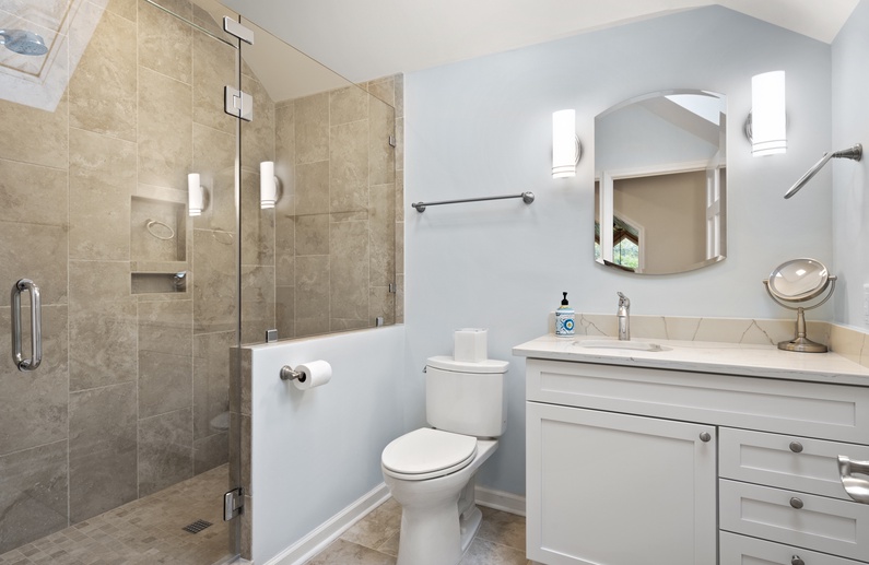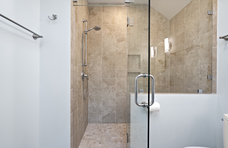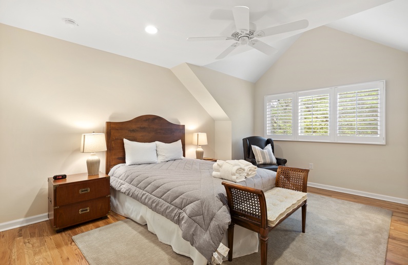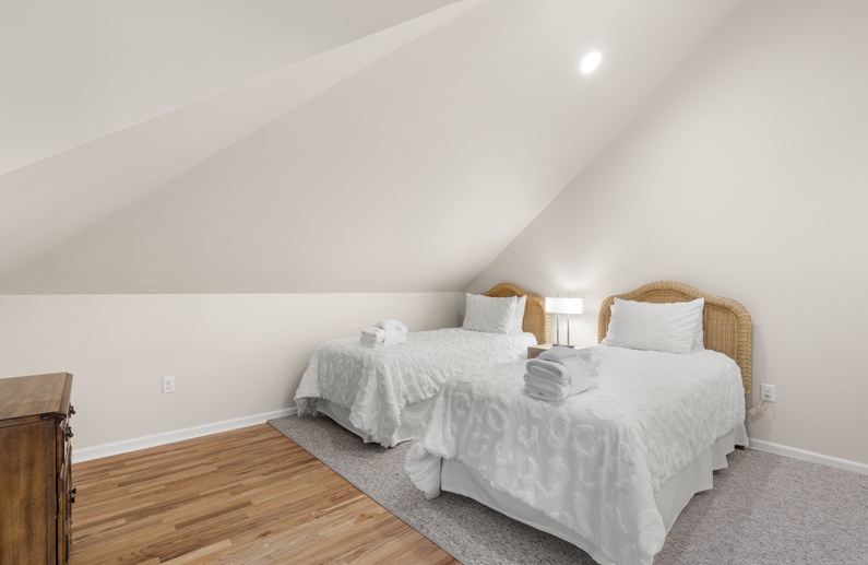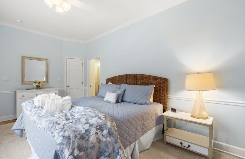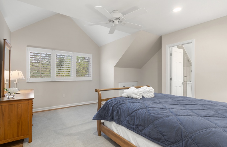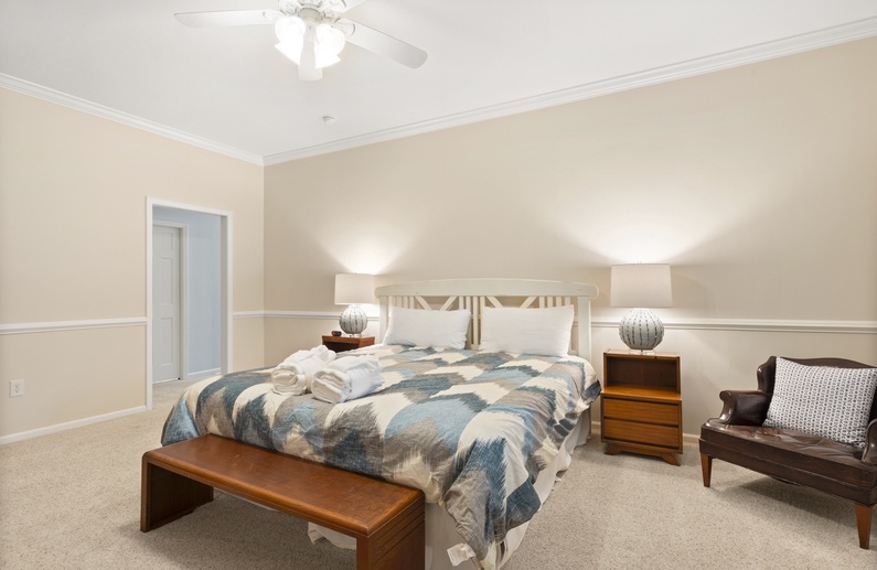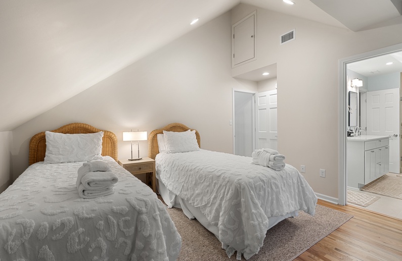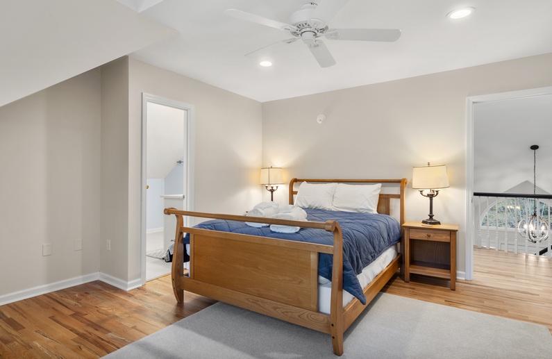 The primary bedroom is on the main floor and has a king-sized bed and a private bathroom. A bedroom with a king-sized bed and private bathroom are also found on this floor. Upstairs, you will find the three remaining bedrooms. Two bedrooms, one with a queen-sized bed and the other with two extra-long twin beds, have shared entry to a full bathroom with a walk-in shower. The final bedroom offers a queen-sized bed and convenient access to a full hallway bathroom with a walk-in shower.