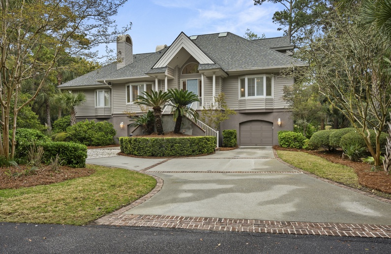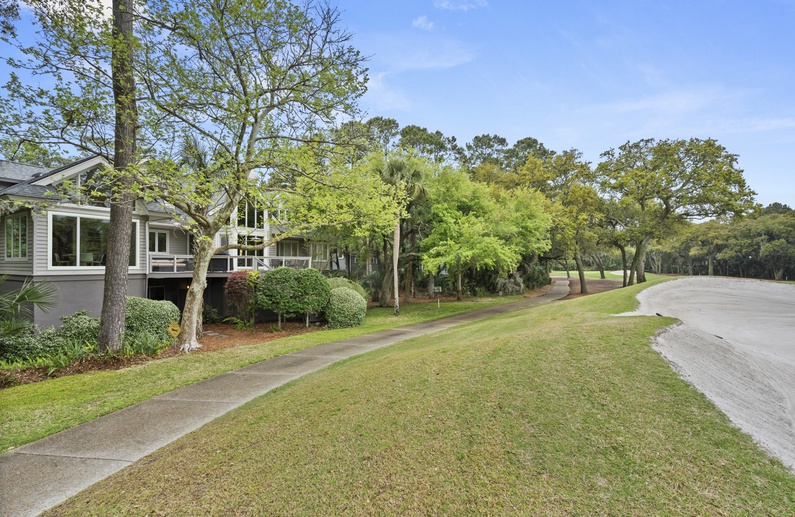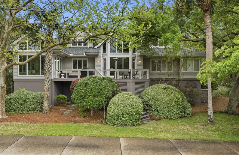 This Kiawah Island vacation rental offers beautiful views of Cougar Point Golf Course, five bedrooms, a sunroom overlooking the golf course, and an outdoor shower. The home is about a 7-minute walk to the beach.