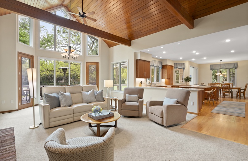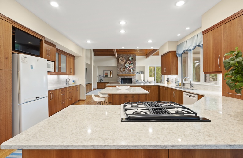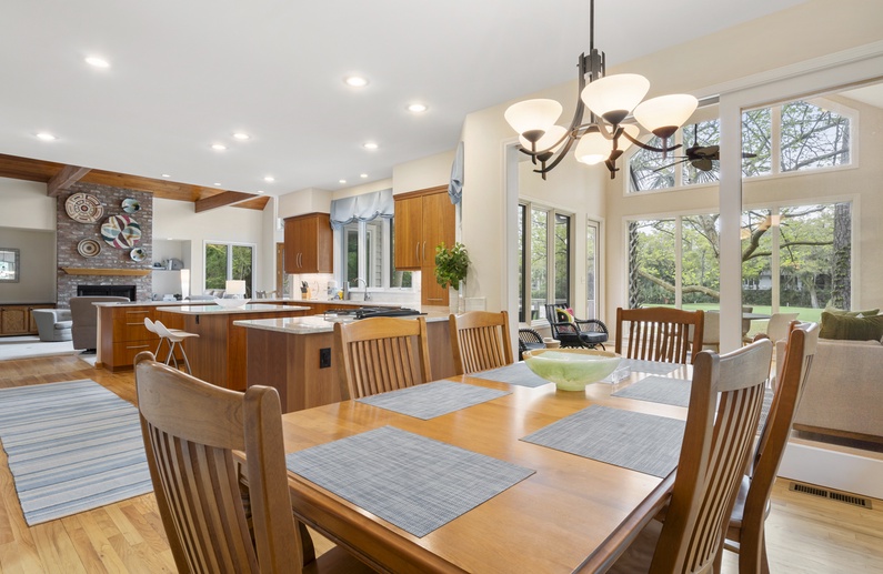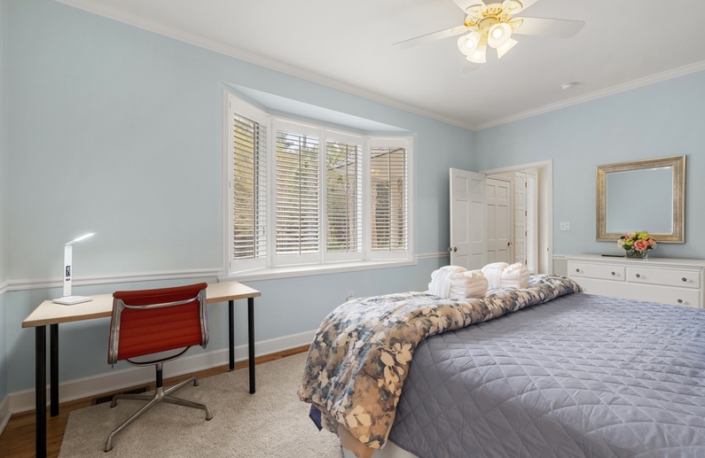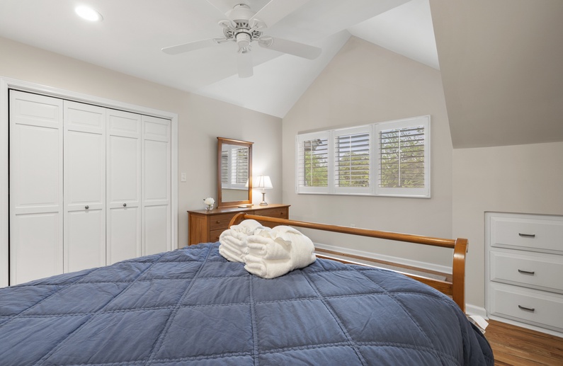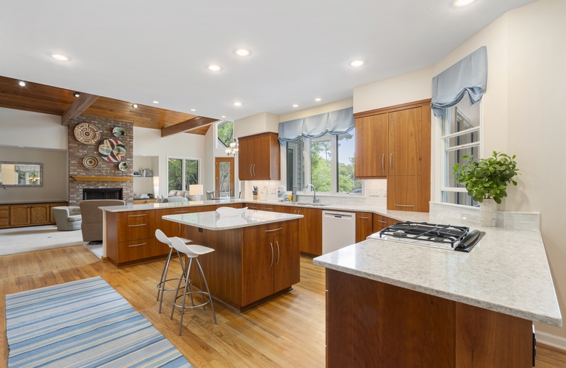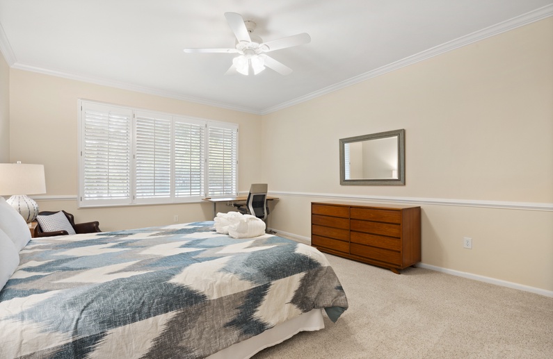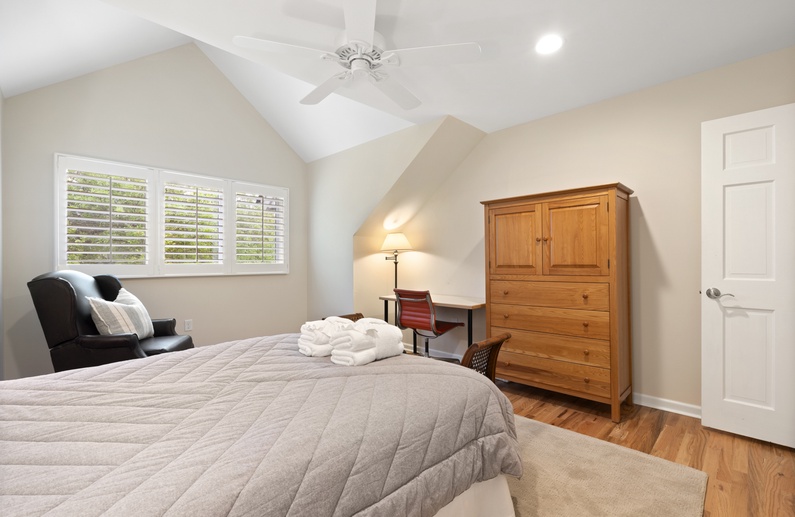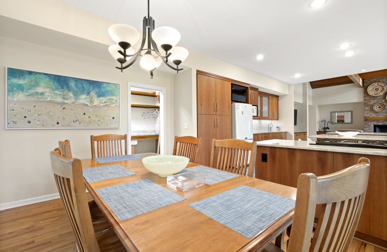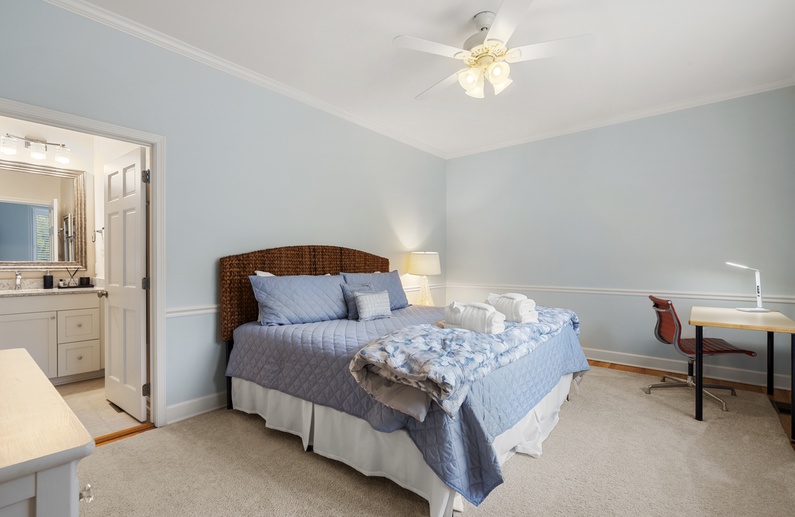 When you enter the home, you are greeted with natural light, wonderful golf views, and a warm feel. The family room has lofted ceilings, a sofa and cozy chairs, a large flat-screen TV, and access to the deck. The dining room features a table that seats six, perfect for family meals while on vacation. The fully equipped kitchen has everything you will need for your meals, including a counter with two bar stools. Enjoy working remotely in the study with a desk and office chair.