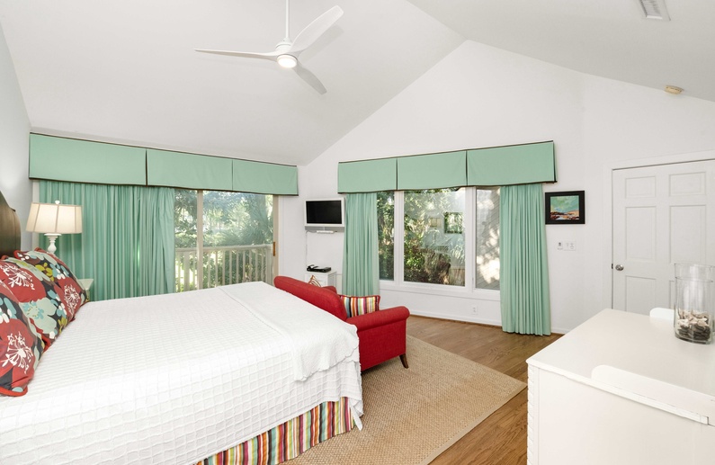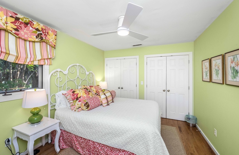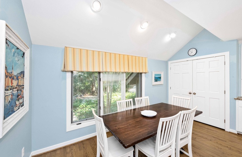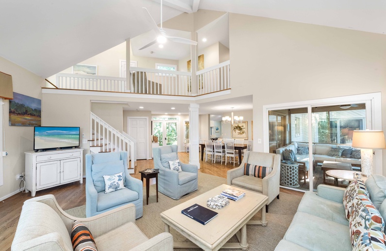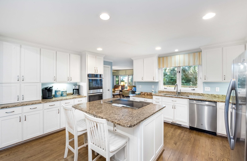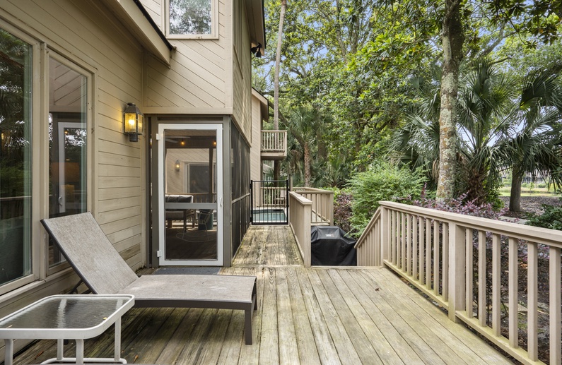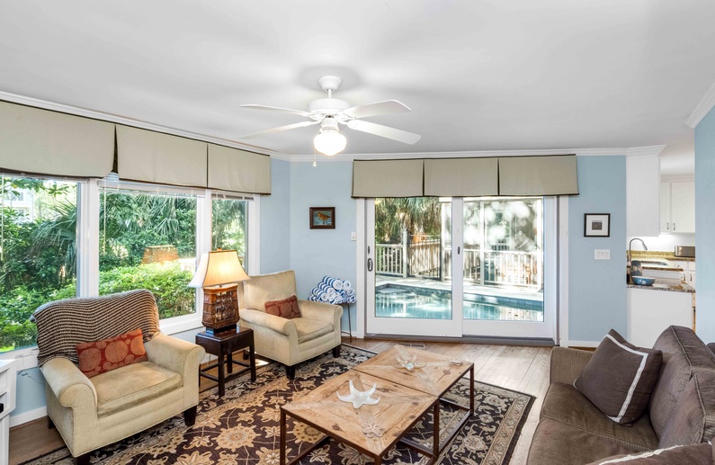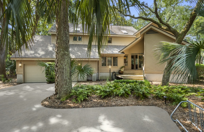 This Kiawah Island vacation rental features four bedrooms and a private pool and is about a 5-minute walk to the beach. Situated on a quiet cul-de-sac, this home offers golf views and is adjacent to a lagoon with a bridge for viewing wildlife and flora.