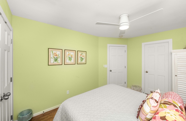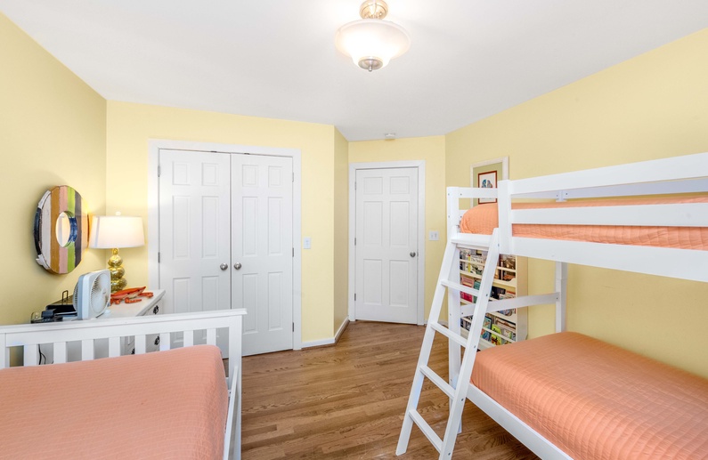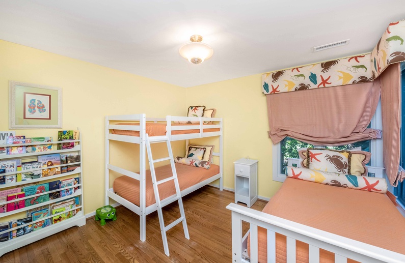 The first floor offers a queen bedroom and bathroom, while the second floor houses three additional bedrooms. The primary suite features a king bed, flat-screen TV, private deck, and private bathroom. Two other bedrooms – a queen bedroom and a bedroom with bunk bed and twin bed – share a hall bathroom.
