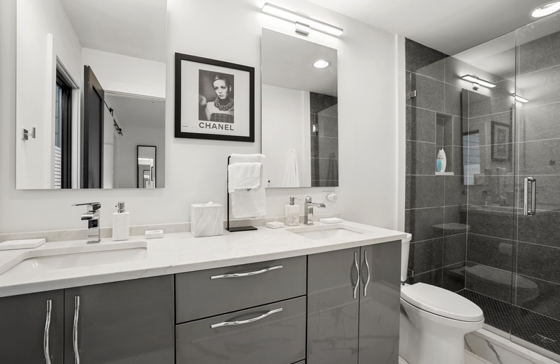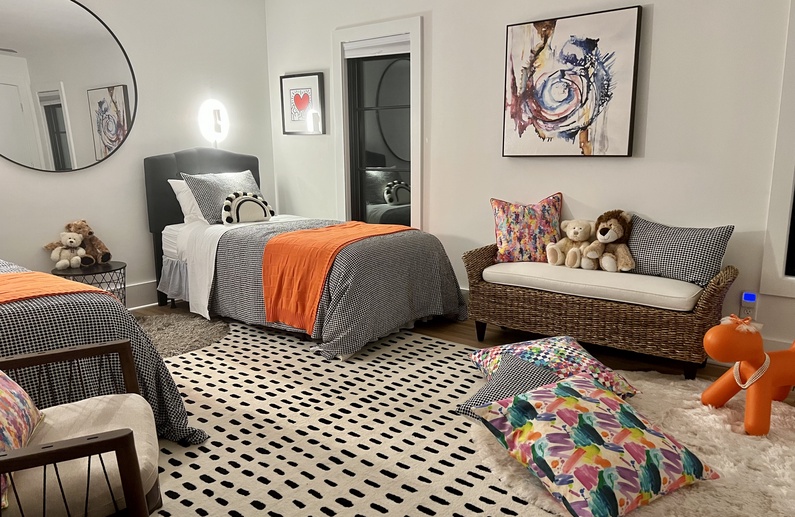 The main level offers a secondary suite with a king-sized bed, a sitting room with a daybed and TV, access to the deck., and a gorgeous private bathroom. The sitting room is separated from the main bedroom with a barn door, making it perfect for additional living or sleeping space. A bedroom with two twin beds and a full hall bathroom add to the first-floor accommodation.
