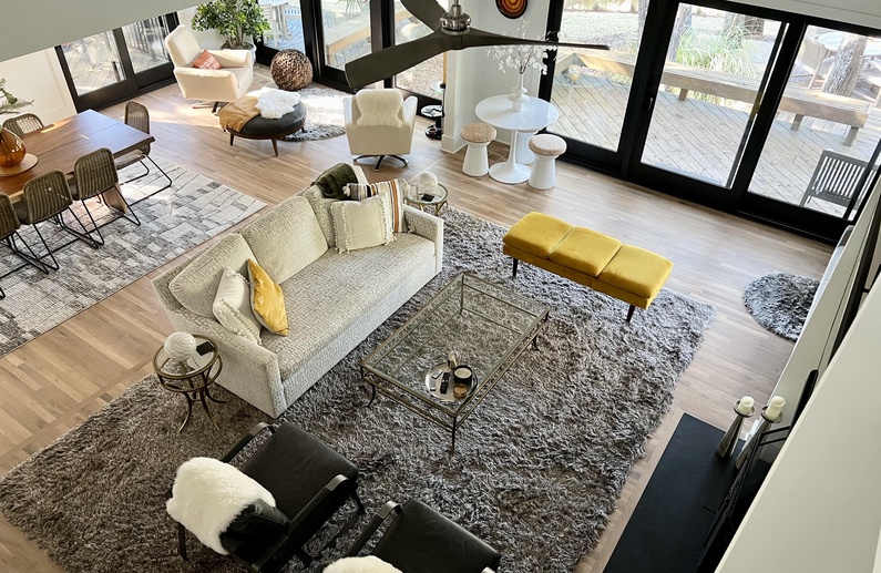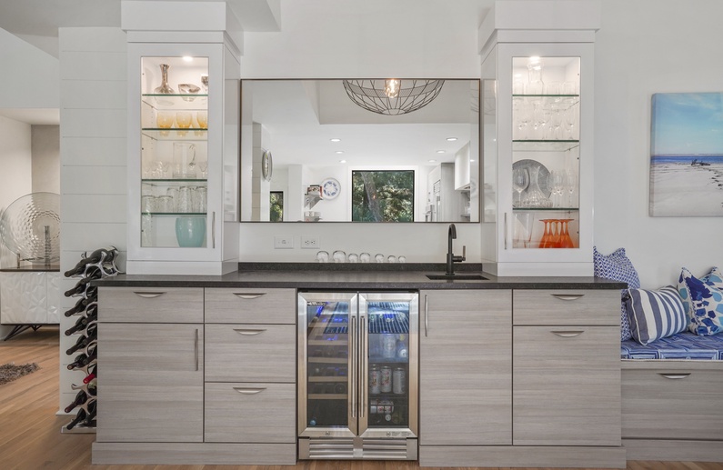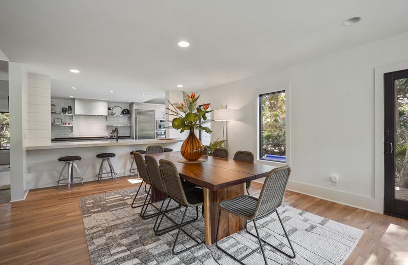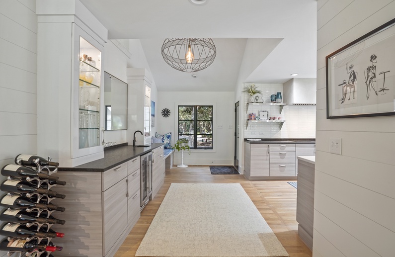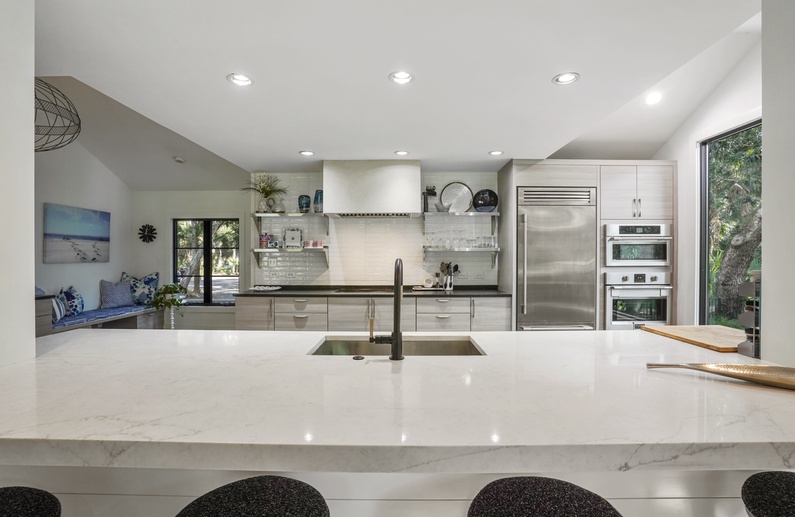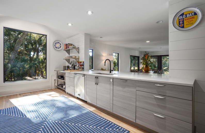 The home has stylish furnishings and is filled with personal touches. As you enter, the open floor plan, tall ceilings, and wall of windows will catch your eye. There is plenty of cozy seating to enjoy the uninterrupted views and wildlife or watch TV. A large dining table provides a hub for gathering. The gourmet kitchen is packed with top-end Italian appliances, including two ovens, microwave, and induction cooktop. The twelve-foot center island with four barstools provides additional dining space. The spacious kitchen opens to the bar and drinks area with a wine cooler and sink. There is plenty of storage in the mudroom area to store beach towels and outdoor wear.