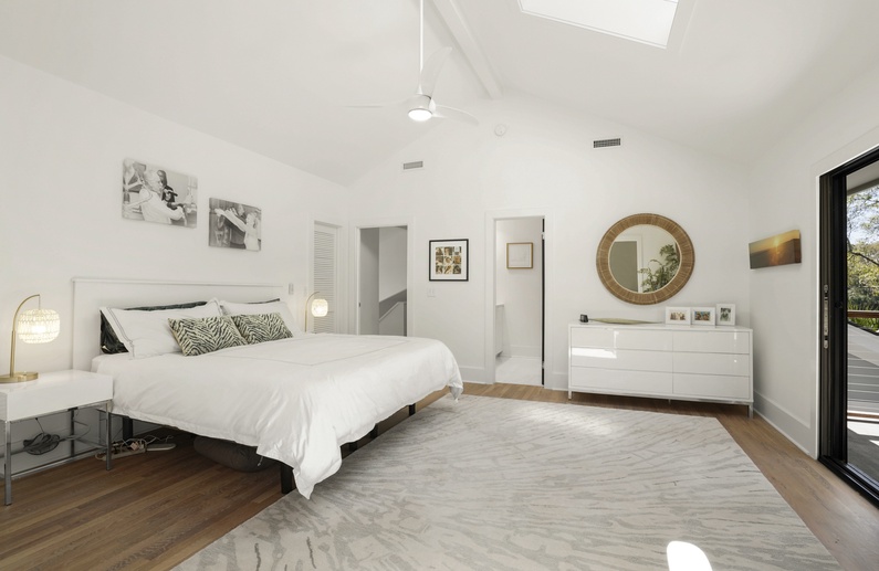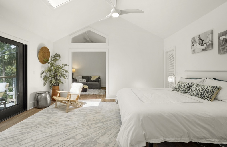 The second floor houses two bedrooms: the primary bedroom and a queen bedroom. The primary suite features a king bed, private deck, luxurious private bathroom, and private sitting room with TV. A bedroom with a queen bed and full bathroom complete this second-floor accommodation.