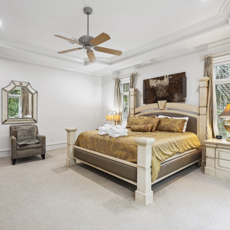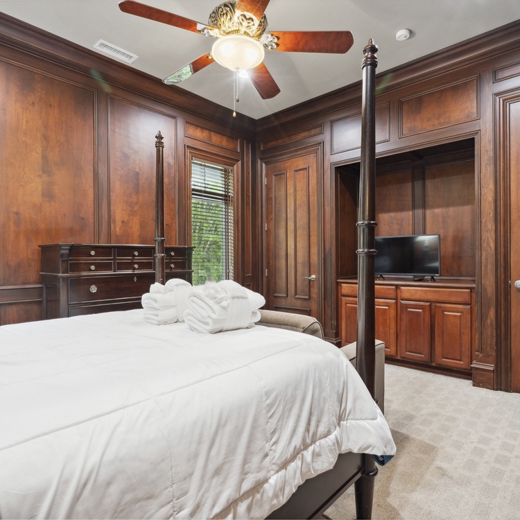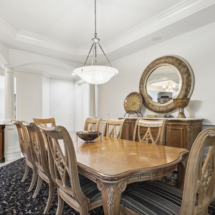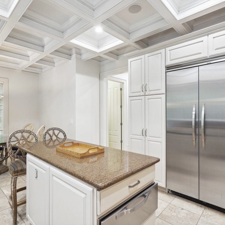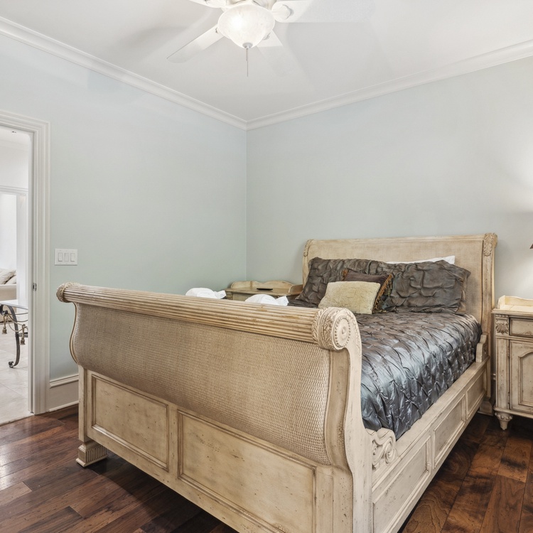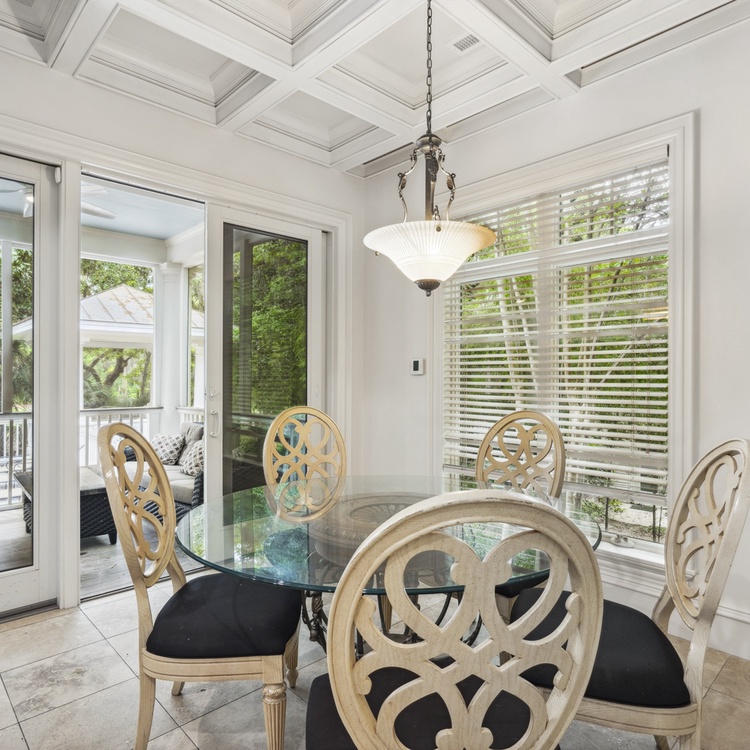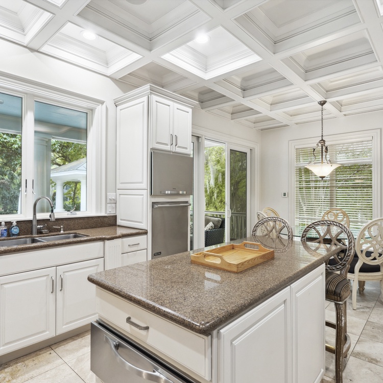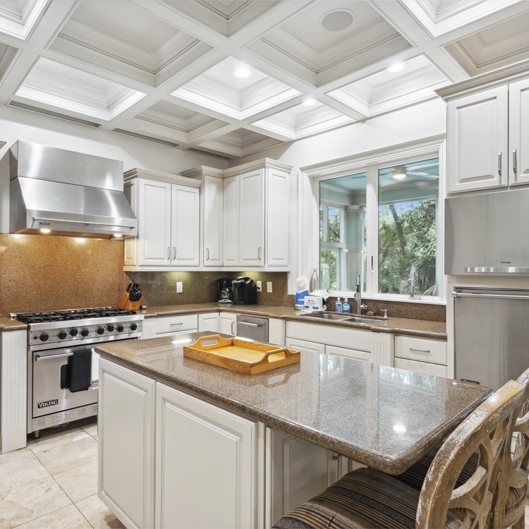 Upon entering the foyer, you will immediately notice the stately details and high ceilings. The main floor living space offers comfortable seating, TV, and access to the pool deck. You will also find a second living area upstairs with TV and access to the balcony. You will find the kitchen just down the hall from the first-floor living room. The eat-in kitchen features stainless steel appliances, bar stool seating for two at the island, and gorgeous coffered ceilings. The formal dining area at the front of the home has seating for up to ten people.