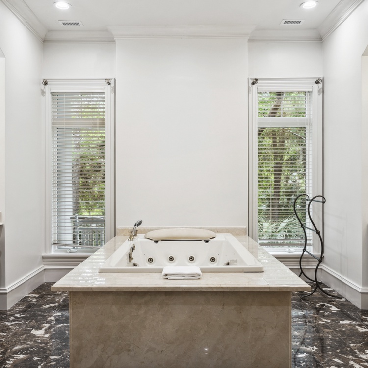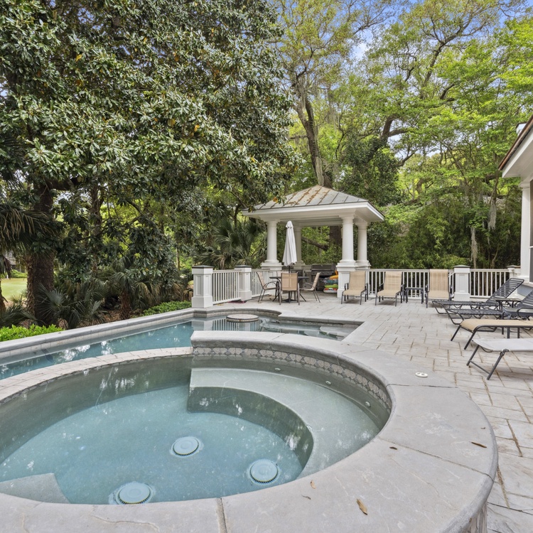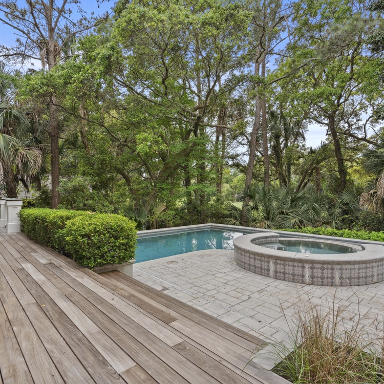 This Kiawah Island vacation rental features 5 bedrooms, a pool and spa, golf course views, and a 10-minute walk to the beach.