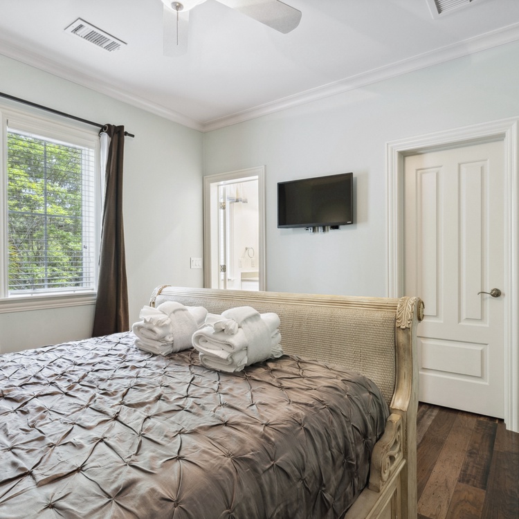 The primary suite on the first floor offers a king-sized bed, access to the deck, TV, and private grand bathroom with shower, bathtub, and vanity. Also on the first floor is a queen bedroom with a twin-size sleeper sofa, flat screen TV, and a hall bathroom. Upstairs, there are three bedrooms with private bathrooms and TVs. One bedroom offers a king bed, another bedroom offers a queen bed, and the last bedroom offers two queen beds.