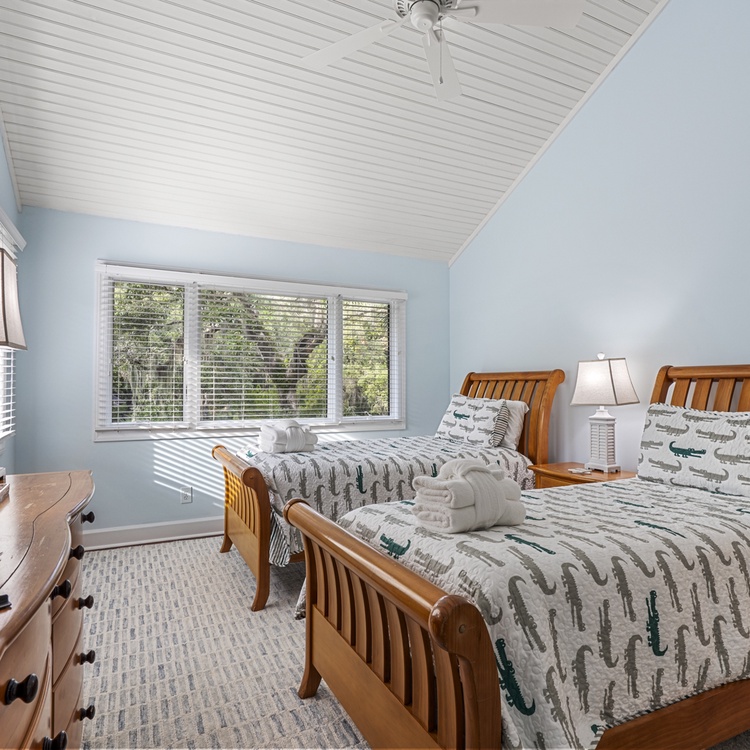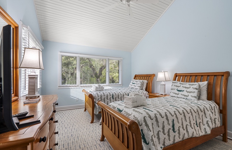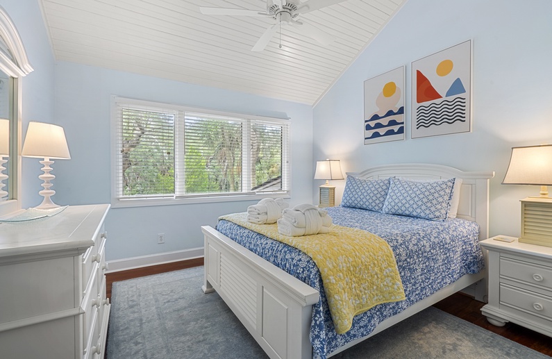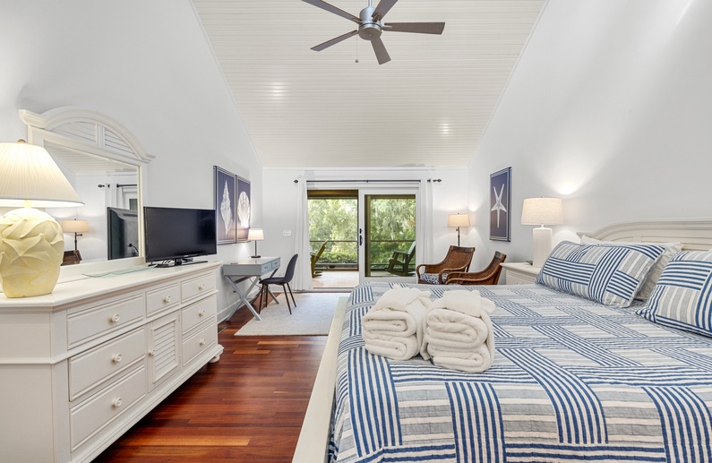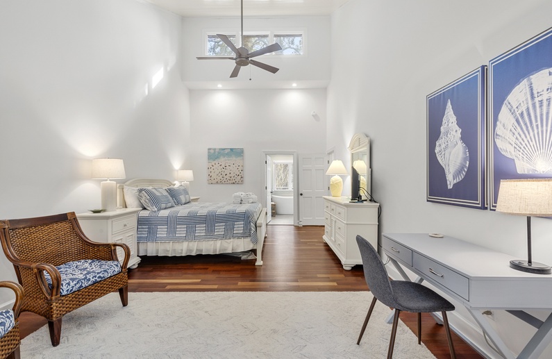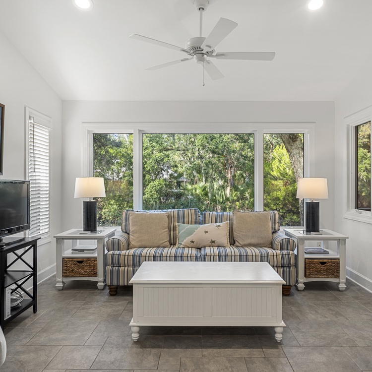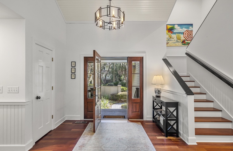 This Kiawah Island vacation rental features 4 bedrooms, a large deck and screened porch, and lovely views of the lagoon. The home is about a 5-minute walk to the beach.