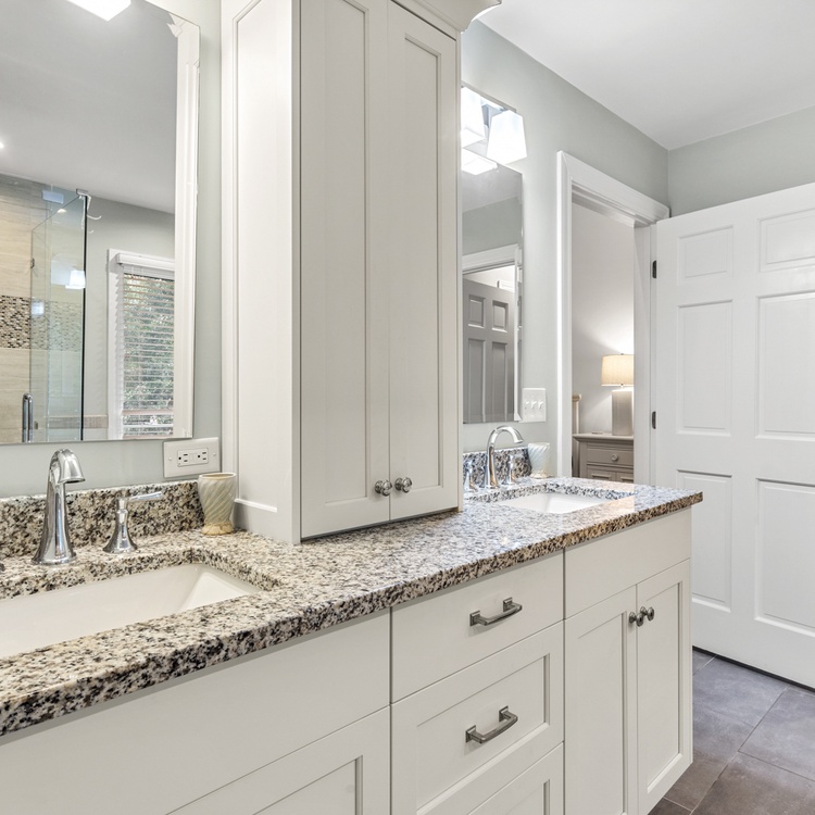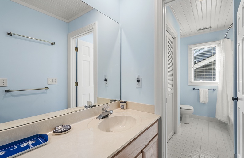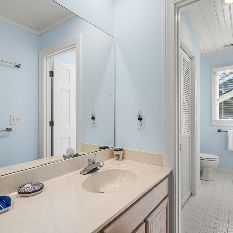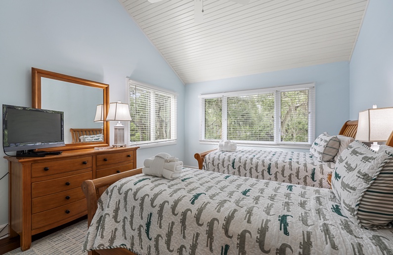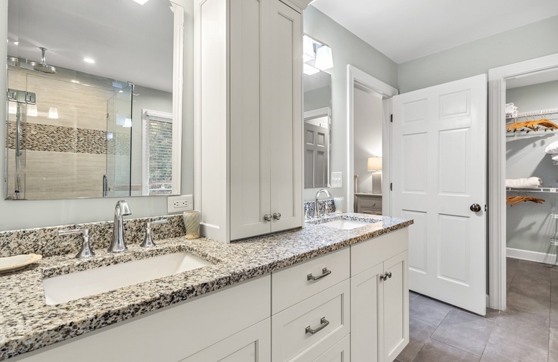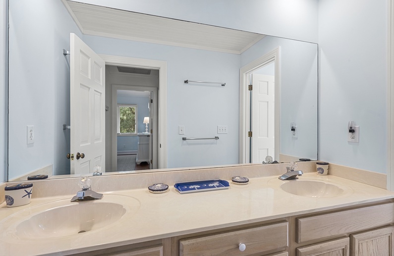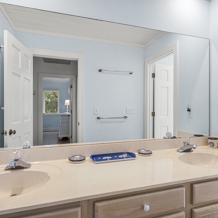 The primary bedroom is on the first floor and has access to the back deck with water views. The bedroom offers a king-sized bed, flat scr-en TV, large walk-in closet, and a gorgeous private bathroom. It features double sinks with granite countertops, large tiled shower, and a soaking tub. On the second level, you will find a large bedroom with a king bed, cozy chairs, a flat-screen TV, and a private bathroom with a tub/shower combination. Just a few more steps up is the third level with one bedroom with a queen bed and flat-screen TV and another bedroom with two twin beds and a flat-screen TV. These two bedrooms share a bathroom with double sinks and a tub/shower combination.