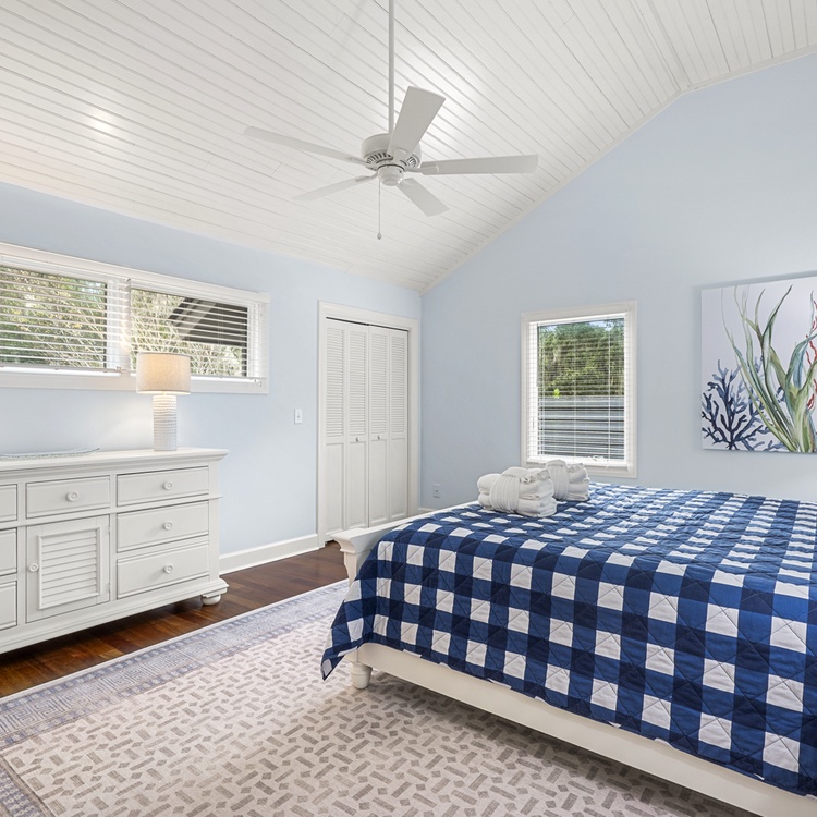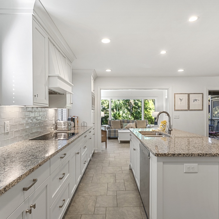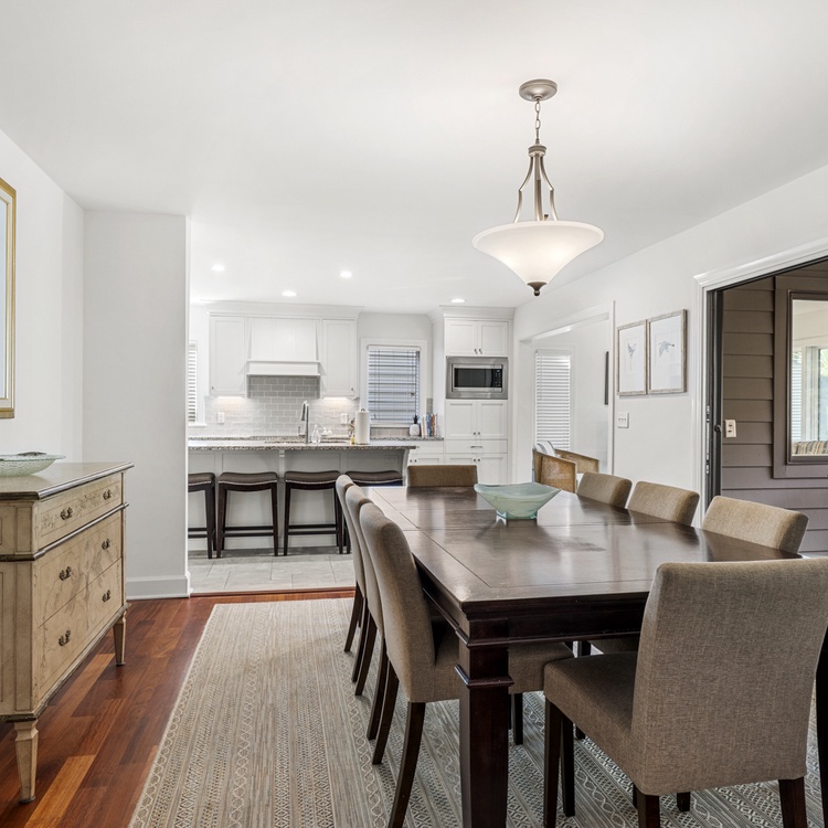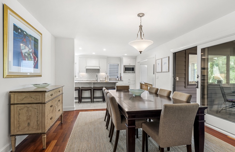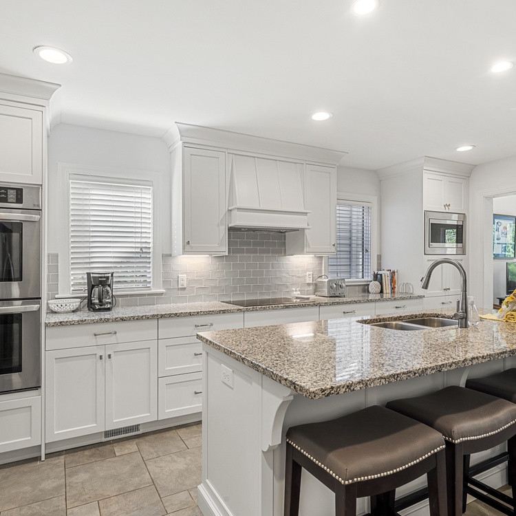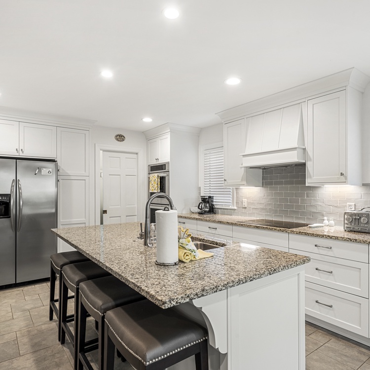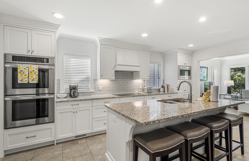 When you enter this home, you are greeted with wonderful lagoon views from the family room directly ahead. The family room has lofted ceilings crafted with tongue and grove bead board, hardwood floors, a sofa and cozy chairs, large flat-screen TV, desk overlooking the lagoon, and access to the back deck. The family room opens to the dining area with seating for 8. The fully equipped kitchen has everything you will need for your vacation meals and includes white cabinets, granite countertops, subway tiles, tile floors, stainless steel appliances, and an island with three bar stools. An enclosed sunroom with water views is off the kitchen and has a sofa, two chairs, and a TV.