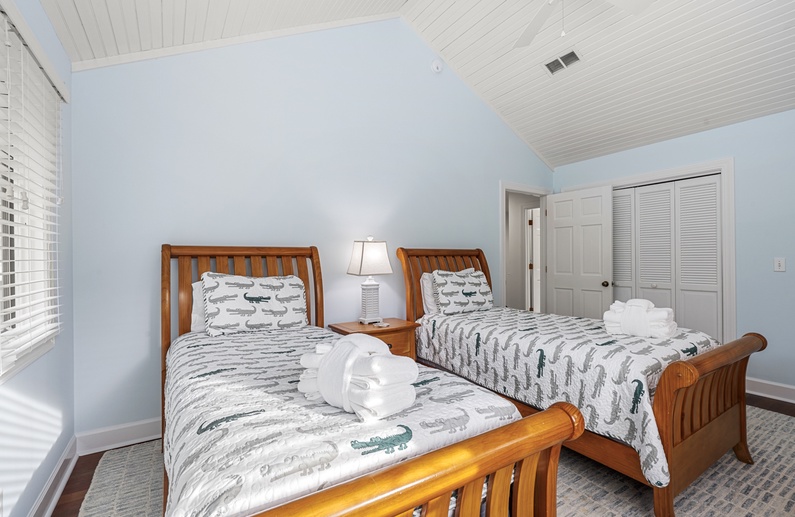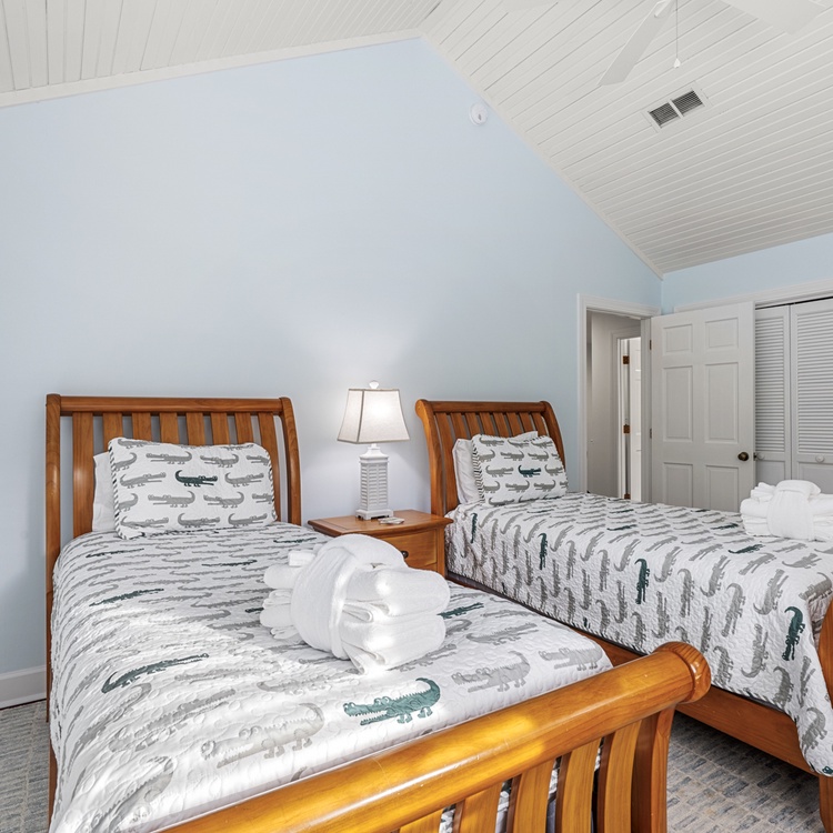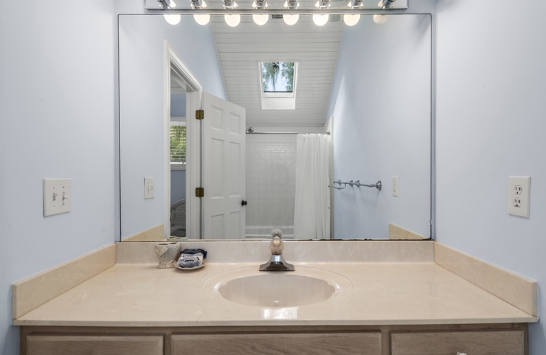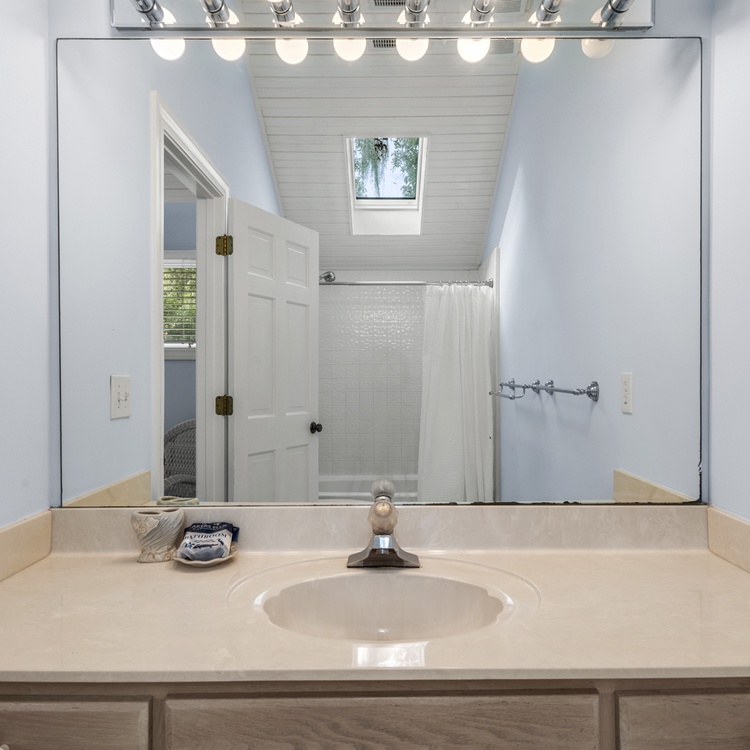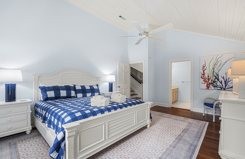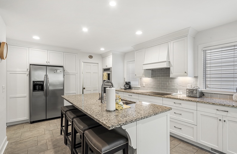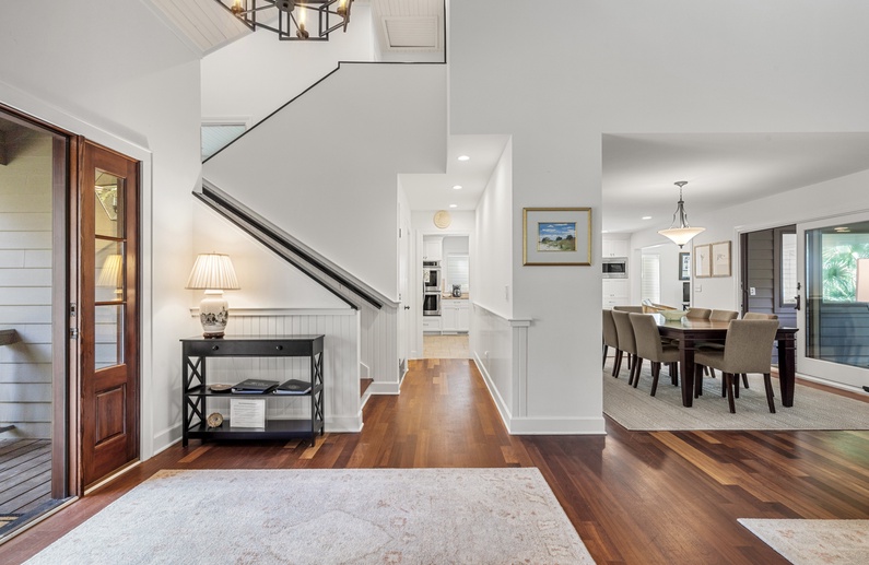 When you enter this home, you are greeted with wonderful lagoon views from the family room directly ahead. The family room has lofted ceilings crafted with tongue and grove bead board, hardwood floors, a sofa and cozy chairs, large flat-screen TV, desk overlooking the lagoon, and access to the back deck. The family room opens to the dining area with seating for 8. The fully equipped kitchen has everything you will need for your vacation meals and includes white cabinets, granite countertops, subway tiles, tile floors, stainless steel appliances, and an island with three bar stools. An enclosed sunroom with water views is off the kitchen and has a sofa, two chairs, and a TV.