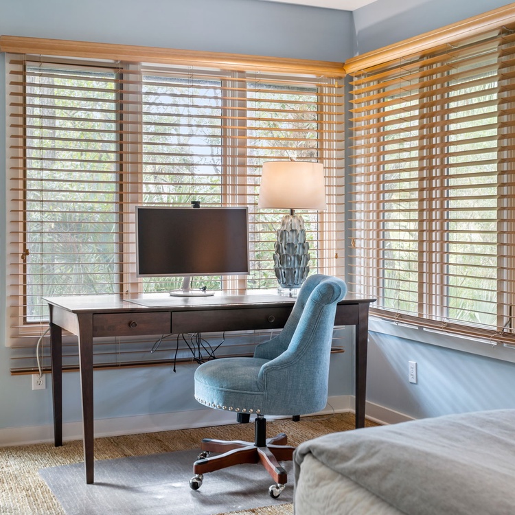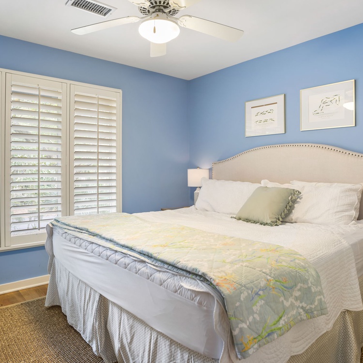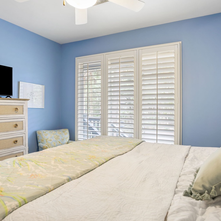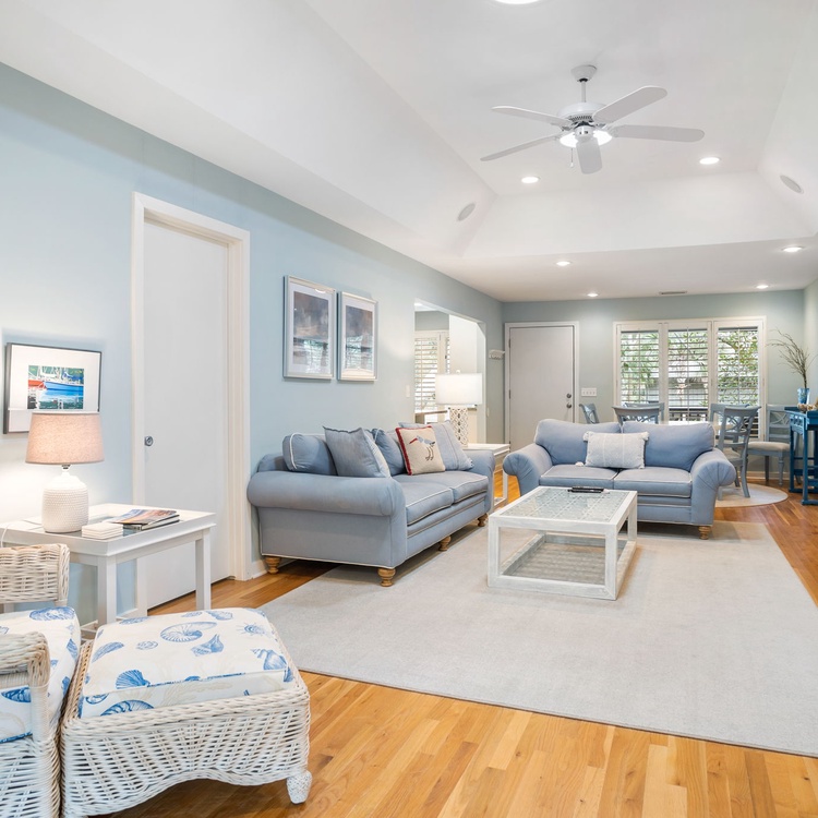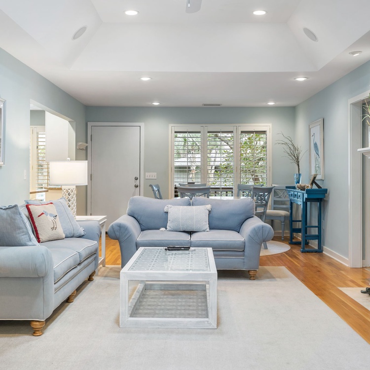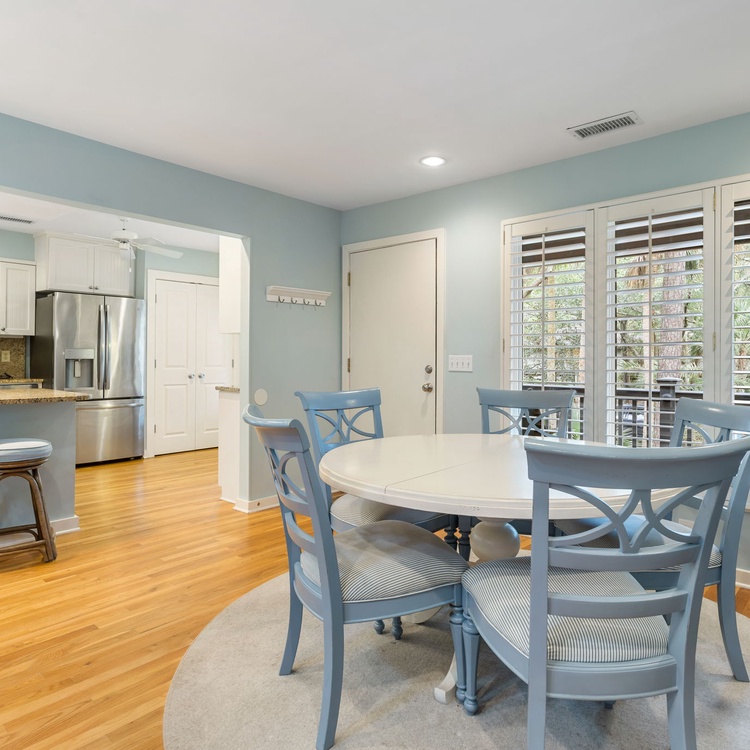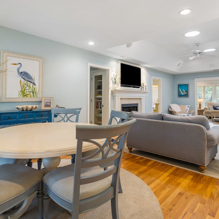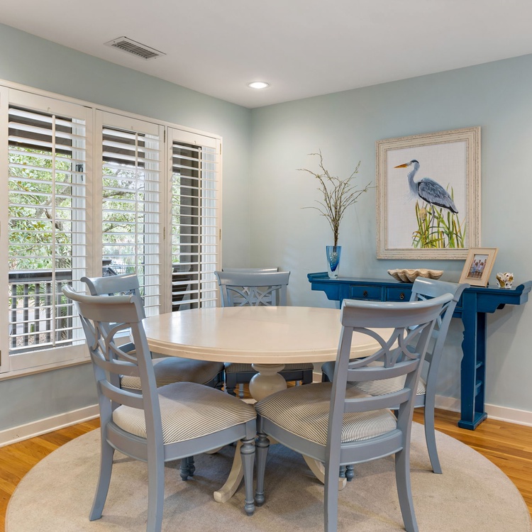 The Night Heron cottage welcomes you with upscale coastal finishes, hardwood flooring, an open floorplan, and plenty of natural light. In the living area, you will find comfortable seating, a flat-screen TV, and calming views of live oaks and palmetto trees. The fully equipped kitchen is just adjacent to the living area and offers ample counterspace to prepare your vacation meals. The dining area also offers scenic views as well as ample seating for your whole party.