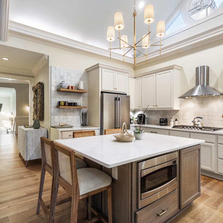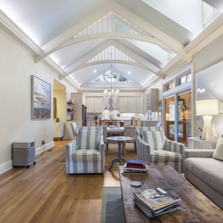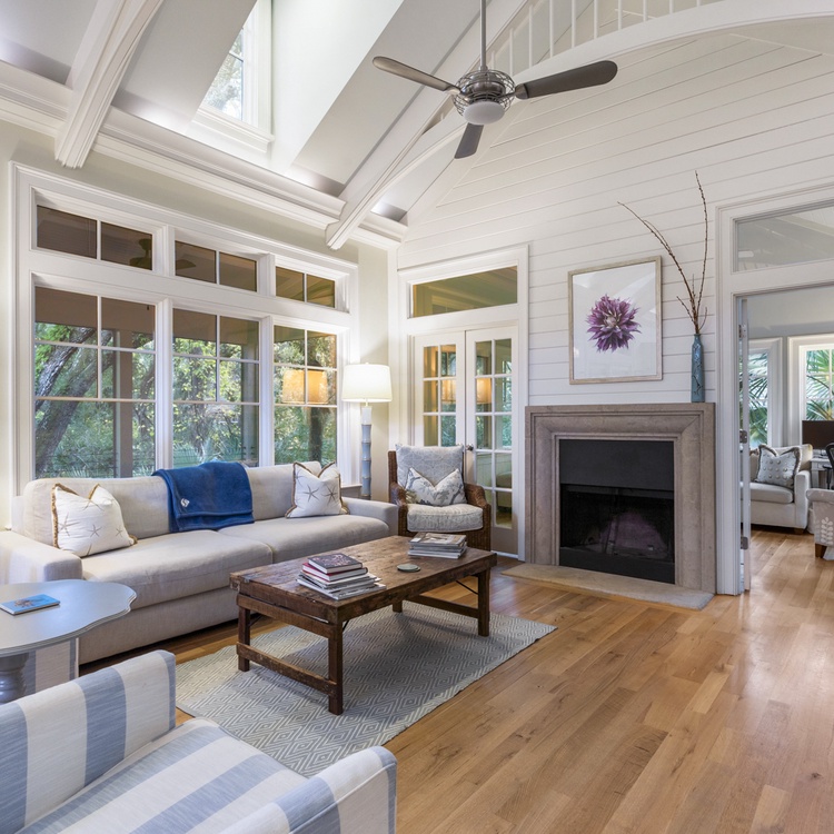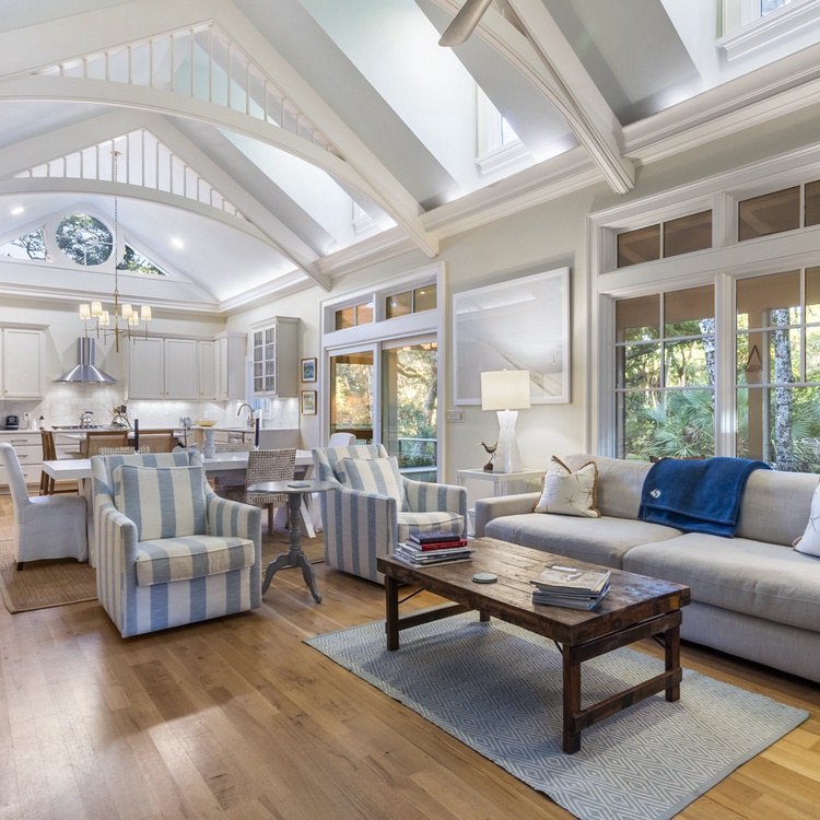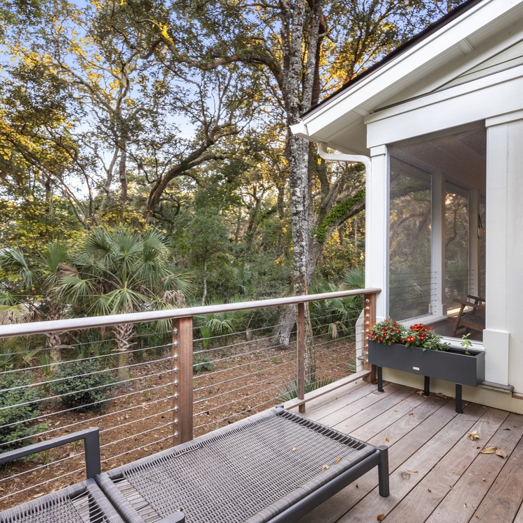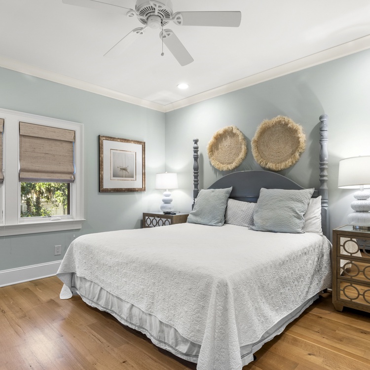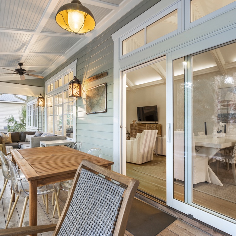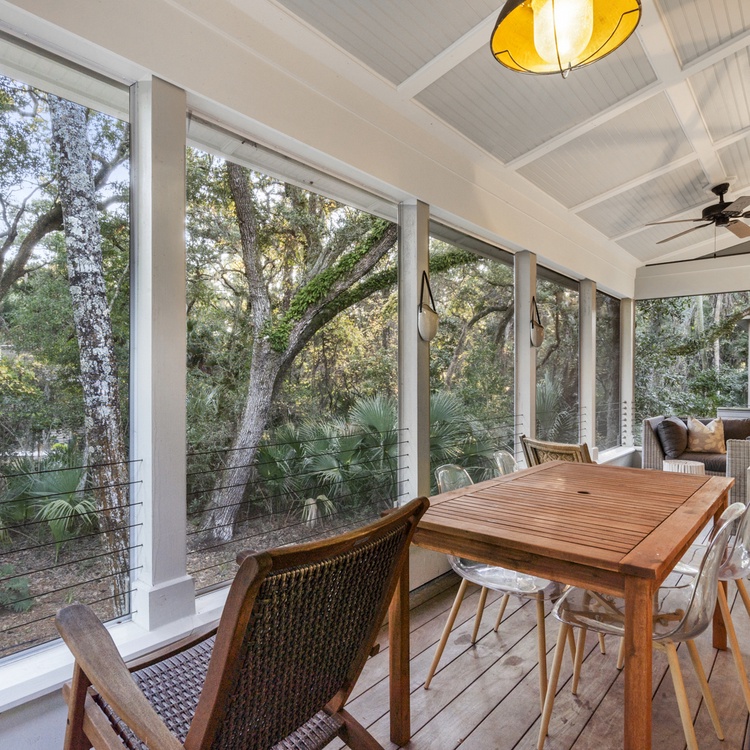 This Kiawah Island vacation rental features four bedrooms, elegant coastal décor, and a lovely screened porch. The home is about a 5-minute walk from the beach.