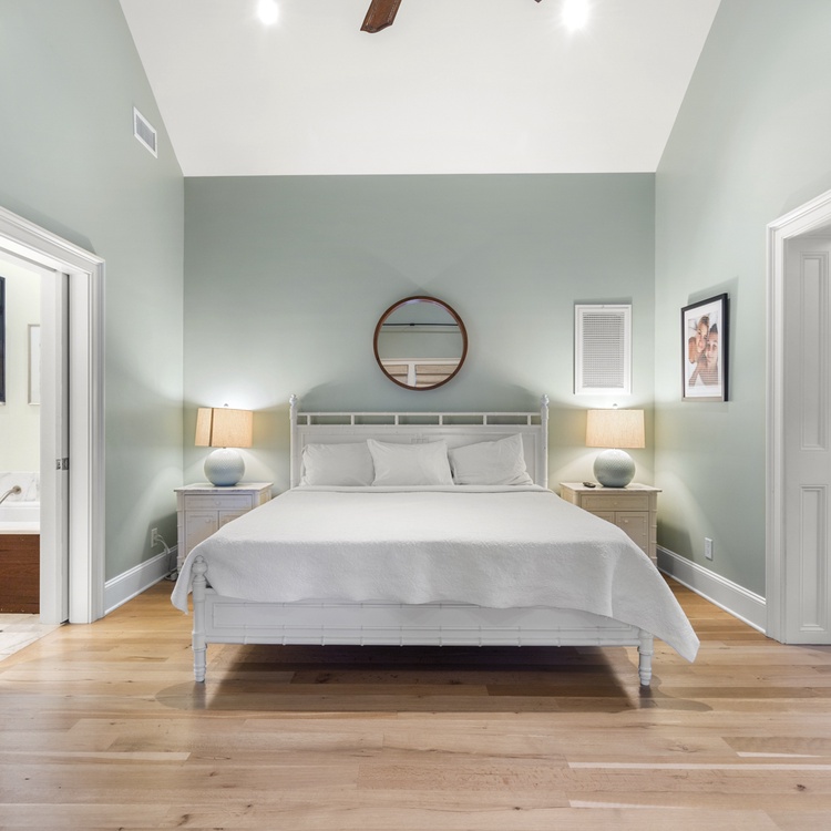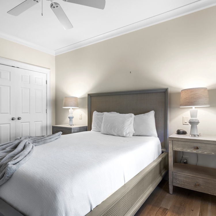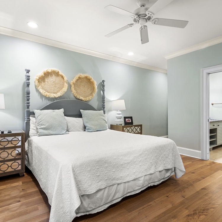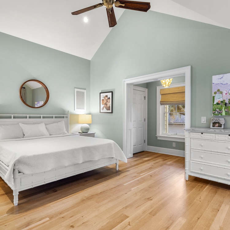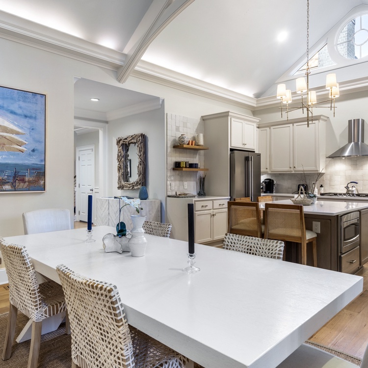 The light and bright living area offers a comfortable sofa, three side chairs, and a flat-screen TV. Past the living room, you will find the sunroom which has a sectional sofa, side chair, flat-screen TV, and an abundance of natural light. The fully equipped kitchen, with stainless steel appliances, a stylish backsplash, and bar stool seating for four, has everything you will need to prepare your vacation meals. The dining area is nestled between the kitchen and living area and is the perfect place to enjoy meals or play games.