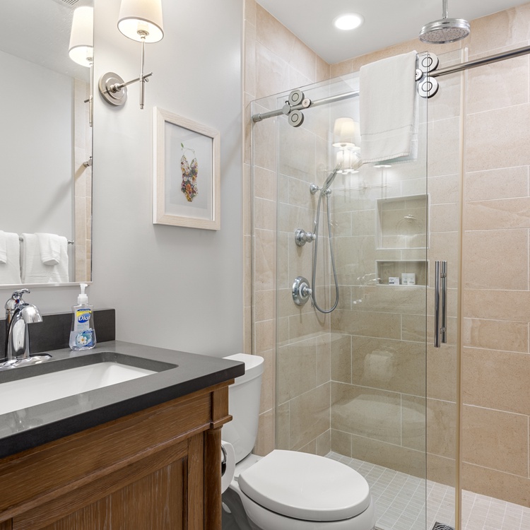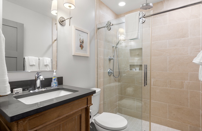 The primary bedroom features a queen-sized bed with ample closet space, while the primary bathroom is equipped with a glass, walk-in shower.