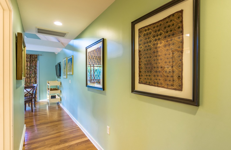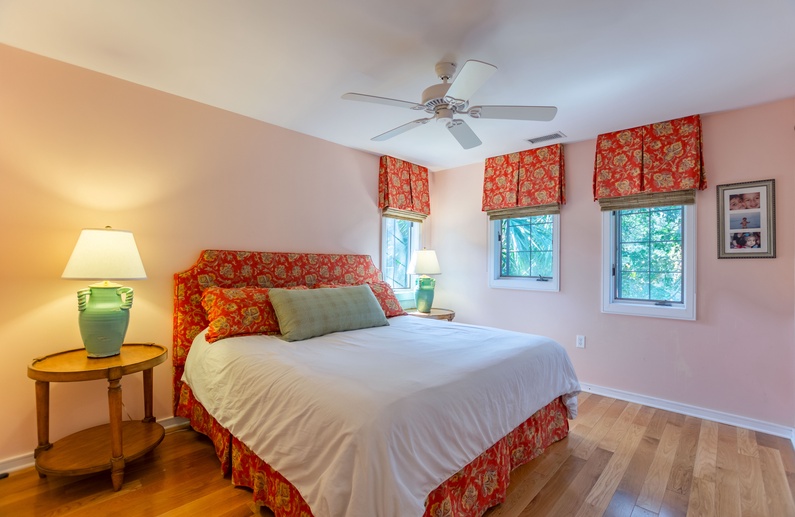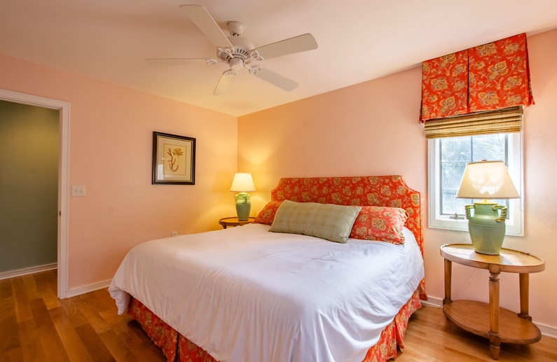 The screened porch, also with an elevated ceiling, provides four chairs and abundant opportunities for relaxing and viewing the surrounding natural beauty and nearby lagoon. A bike path is conveniently located behind the villa, and the beach boardwalk is about a minute’s walk from the villa’s front door.