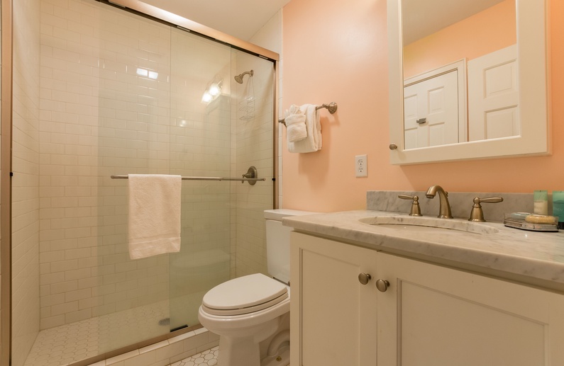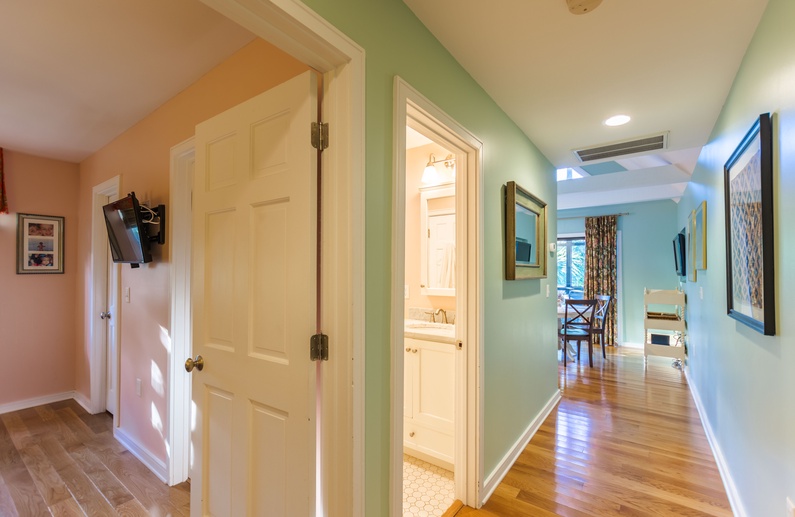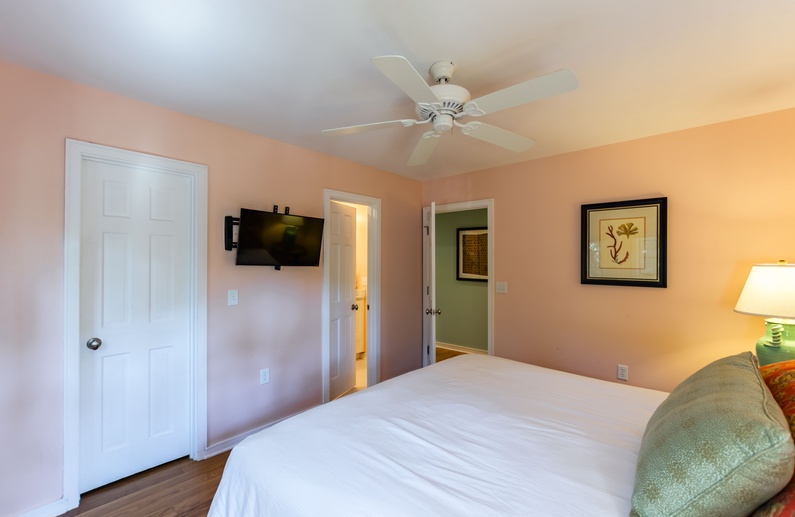 The bedroom features a king bed, wall-mounted flat-screen TV, and private entry to the hall bathroom. The bathroom is conveniently accessible from the bedroom or hallway and offers a large tiled shower.