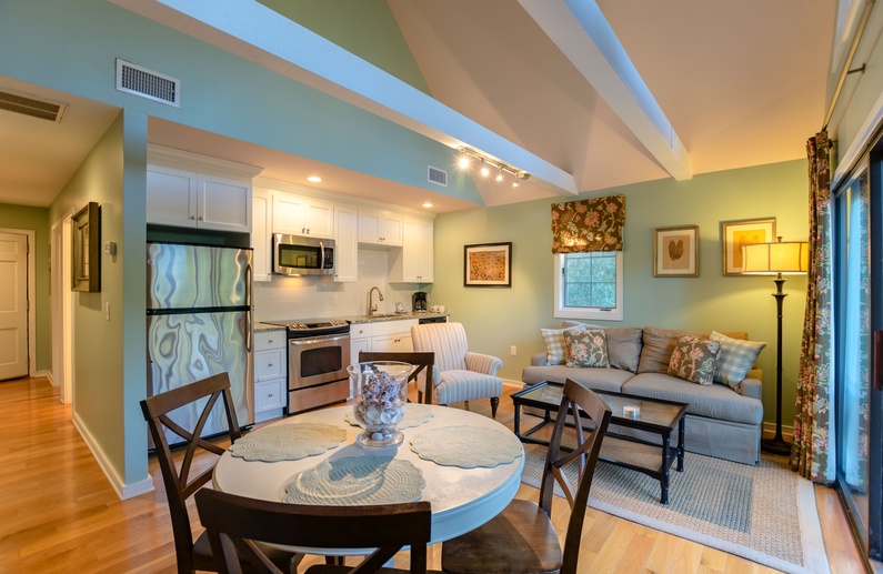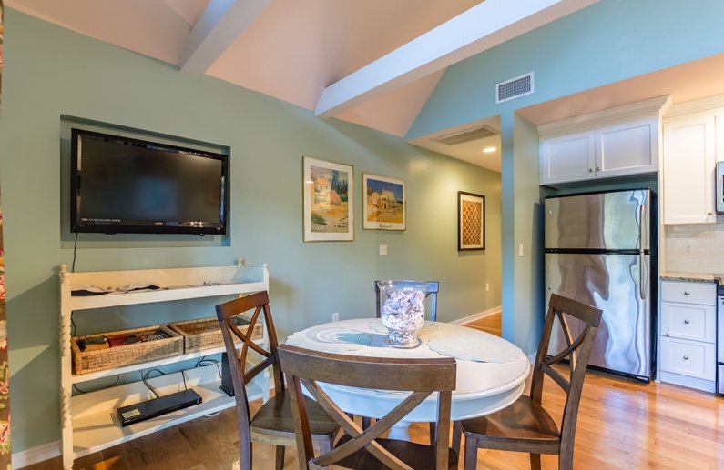 Upon entering the foyer, you are welcomed by a tranquil color palette and hardwood floors. You can go left into the bedroom or straight to the main living space. Down the hallway is the open living space with kitchen, dining, and living areas. The comfortable living room offers a sofa, cozy side chair, wall-mounted TV, and screened porch access. The fully equipped kitchen showcases stainless steel appliances, granite countertops, and white cabinetry and allows for easy meal preparation and entertaining. The dining area features a table with seating for four. The main living space is highlighted by soaring ceilings, a wall of windows and sliding glass door access to the screened porch.